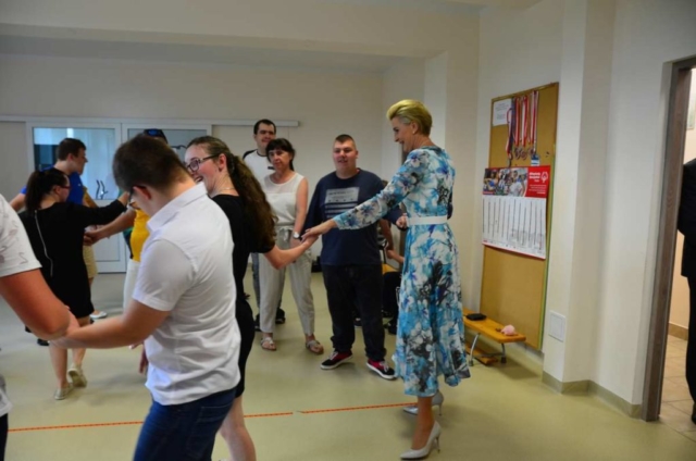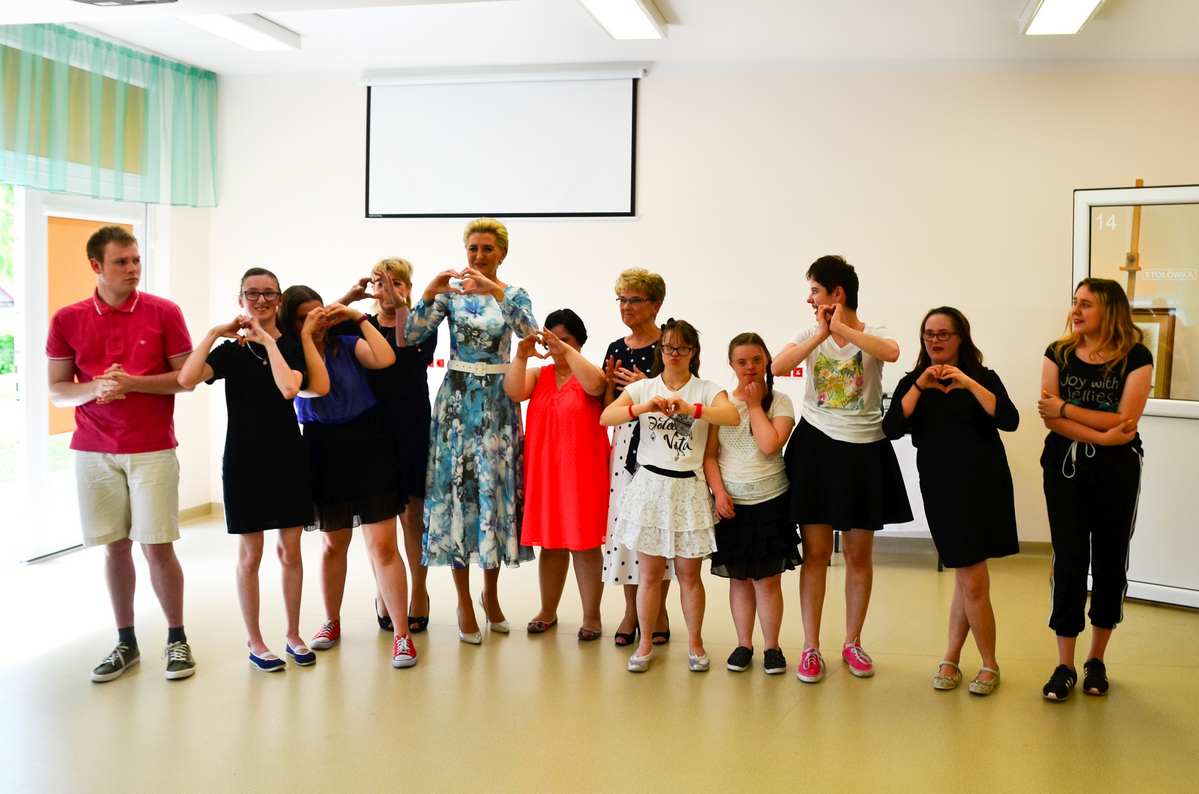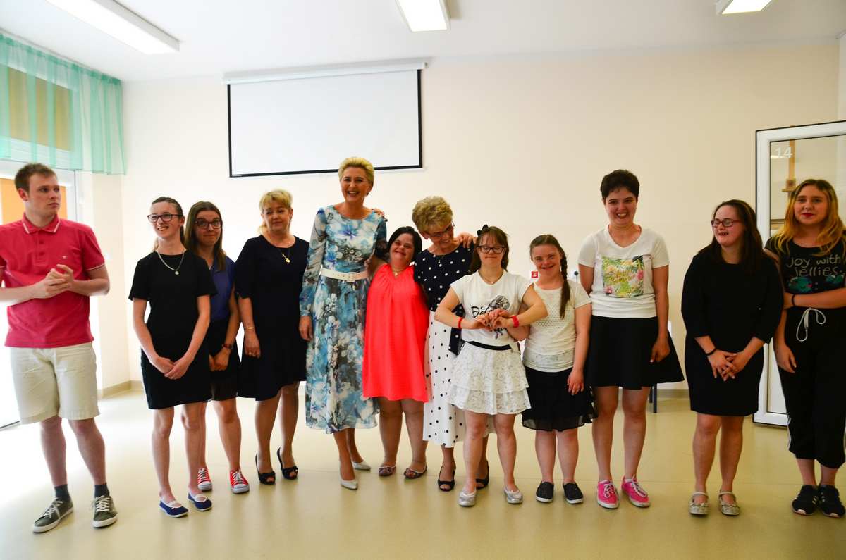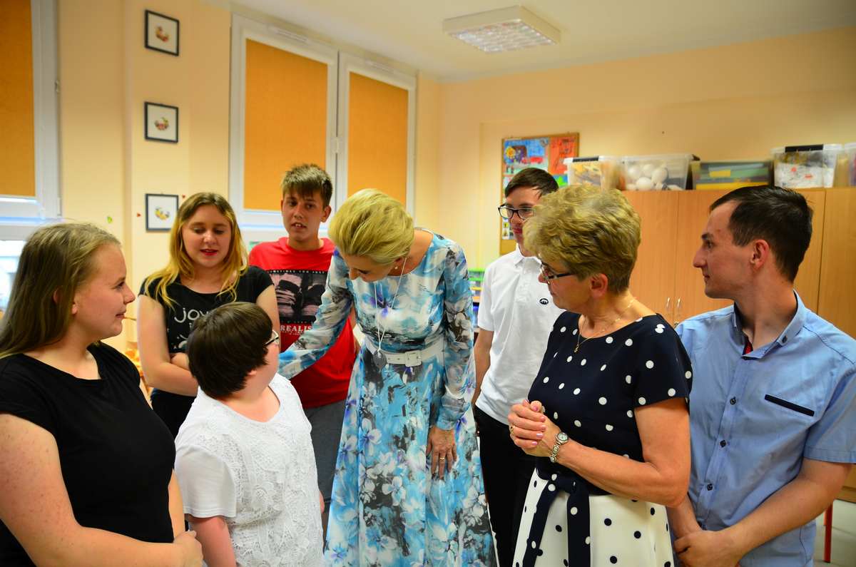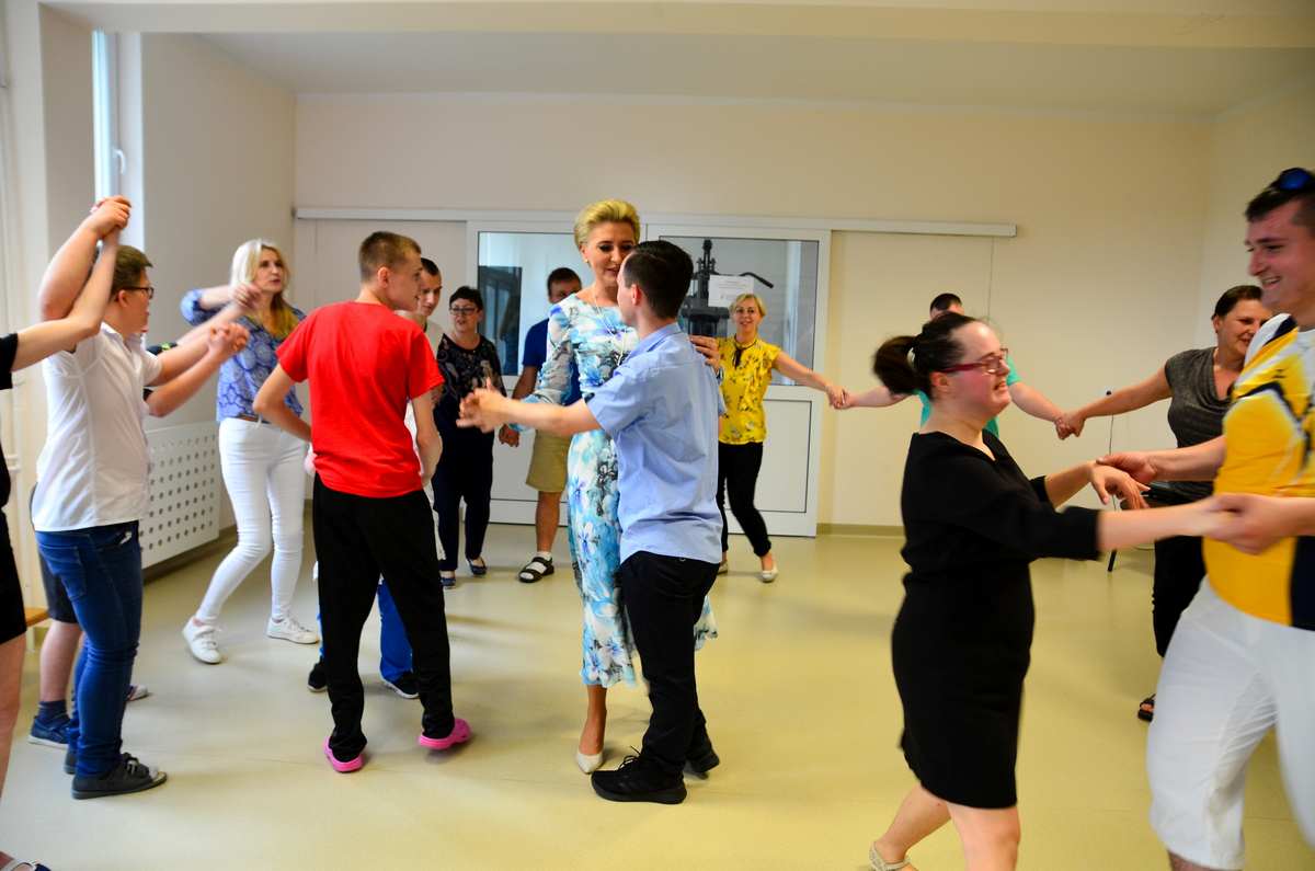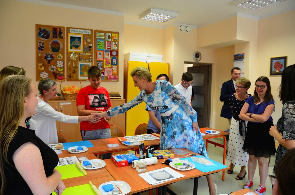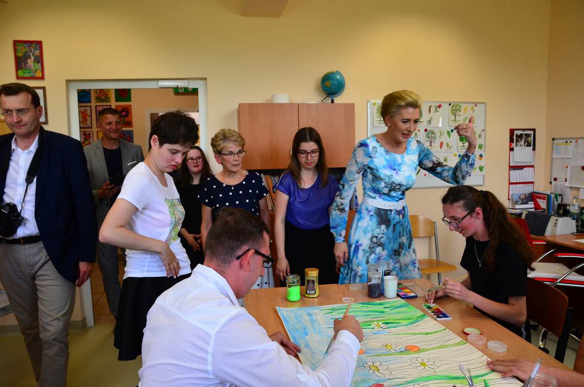 Około południa pani dyrektor Kazimiera Nowak w asyście uczniów powitała Panią Prezydentową w murach naszej placówki. Następnie młodzież zaprezentowała przygotowany wcześniej układ taneczno – muzyczny. Po serdecznym odbiorze występu uczniów przez Panią Prezydentową, cały bieg wydarzeń wymknął się spod ustalonego scenariusza. Młodzież z całym zaangażowaniem i wrodzoną spontanicznością, oprowadziła znamienitego Gościa po naszym Ośrodku rozmawiając o swoich pasjach, ulubionych zajęciach, słuchaniu muzyki, kulinariach, a nawet sadze „Gwiezdne wojny”. Pani Prezydentowa Agata Kornhauser – Duda ze znakomitym skutkiem wzięła czynny udział w zajęciach plastycznych malowania majowej łąki i rękodzielniczych, w czasie których wykonała z młodzieżą piękną glinianą broszkę. Była również okazja do rozmów z rodzicami, nauczycielami i pracownikami Ośrodka, a nawet znalazł się czas na taniec podczas krótkiej dyskoteki szkolnej.