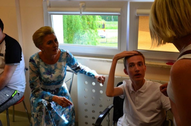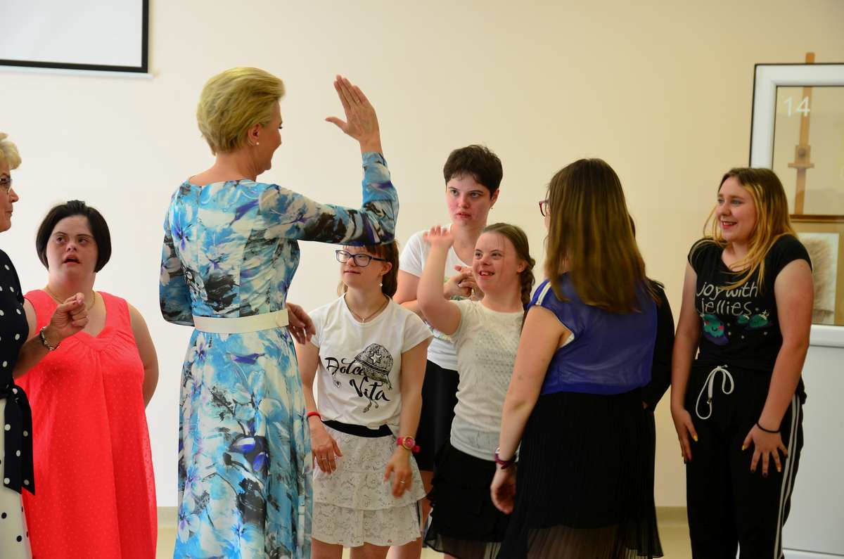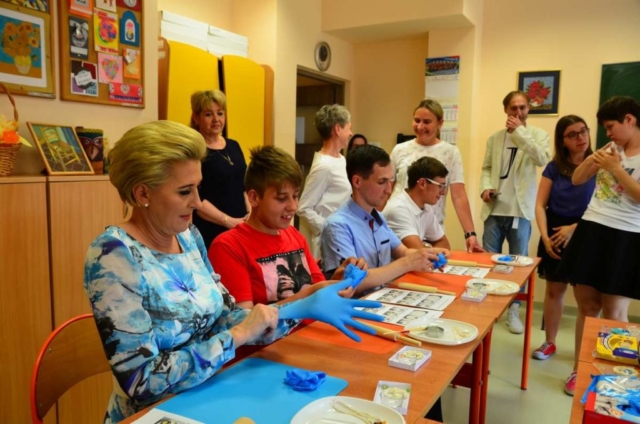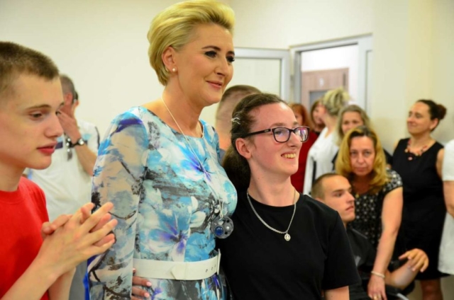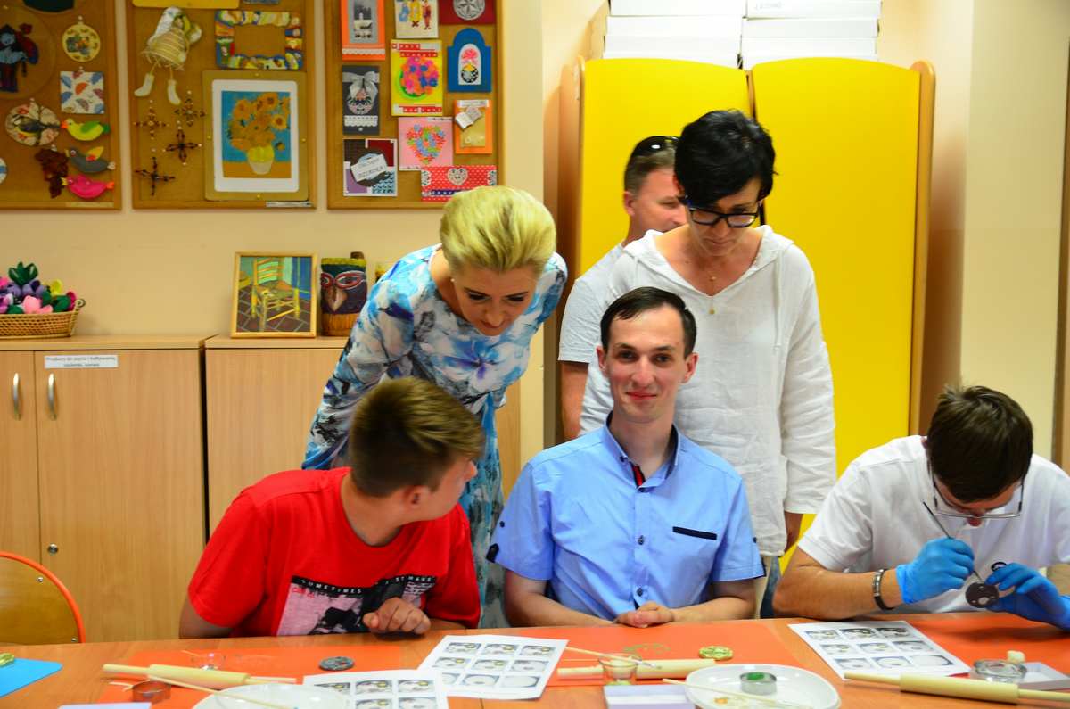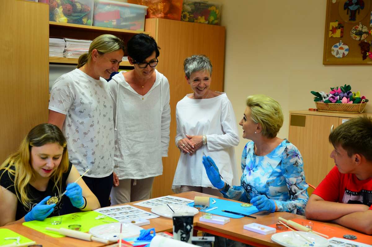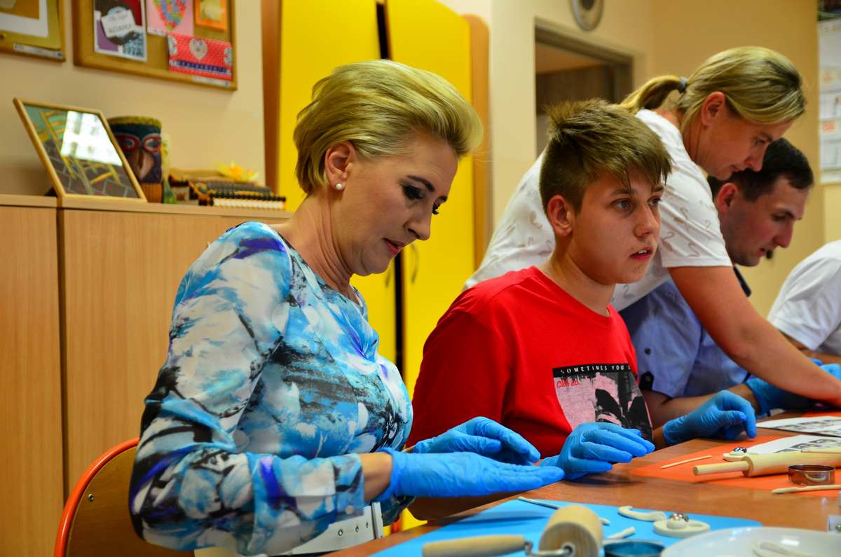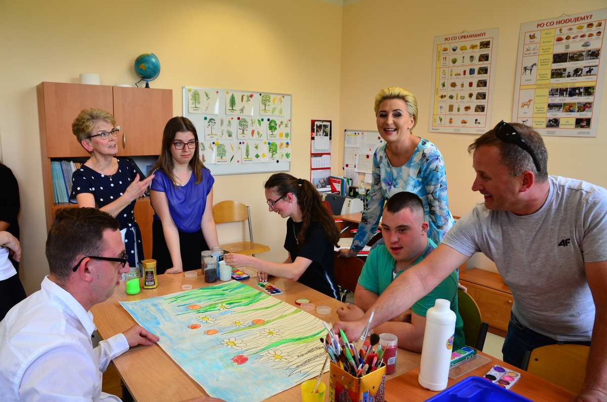 Około południa pani dyrektor Kazimiera Nowak w asyście uczniów powitała Panią Prezydentową w murach naszej placówki. Następnie młodzież zaprezentowała przygotowany wcześniej układ taneczno – muzyczny. Po serdecznym odbiorze występu uczniów przez Panią Prezydentową, cały bieg wydarzeń wymknął się spod ustalonego scenariusza. Młodzież z całym zaangażowaniem i wrodzoną spontanicznością, oprowadziła znamienitego Gościa po naszym Ośrodku rozmawiając o swoich pasjach, ulubionych zajęciach, słuchaniu muzyki, kulinariach, a nawet sadze „Gwiezdne wojny”. Pani Prezydentowa Agata Kornhauser – Duda ze znakomitym skutkiem wzięła czynny udział w zajęciach plastycznych malowania majowej łąki i rękodzielniczych, w czasie których wykonała z młodzieżą piękną glinianą broszkę. Była również okazja do rozmów z rodzicami, nauczycielami i pracownikami Ośrodka, a nawet znalazł się czas na taniec podczas krótkiej dyskoteki szkolnej.
