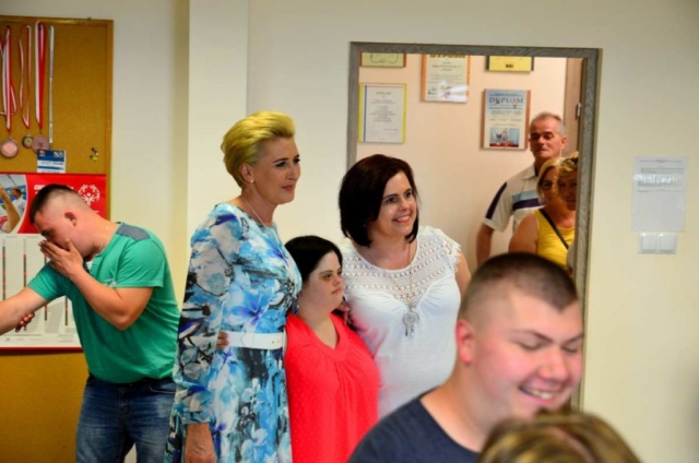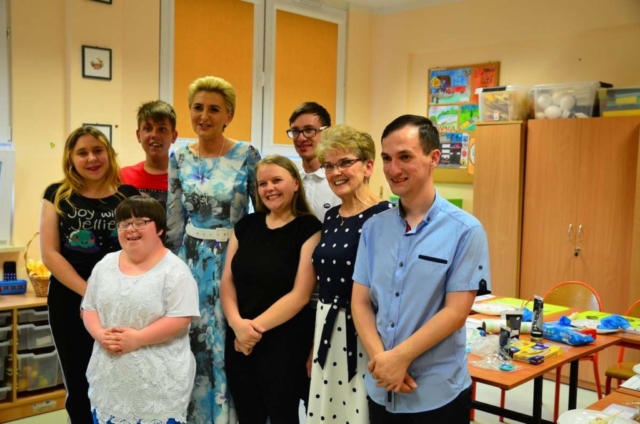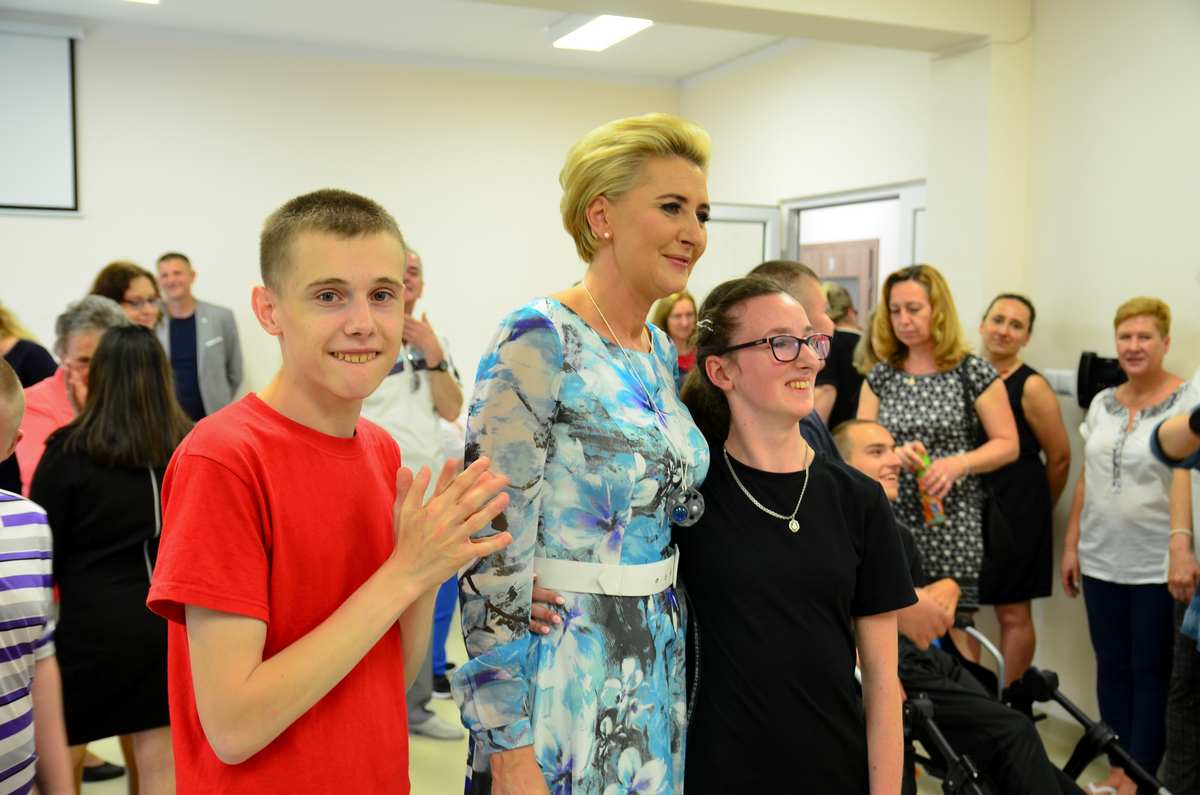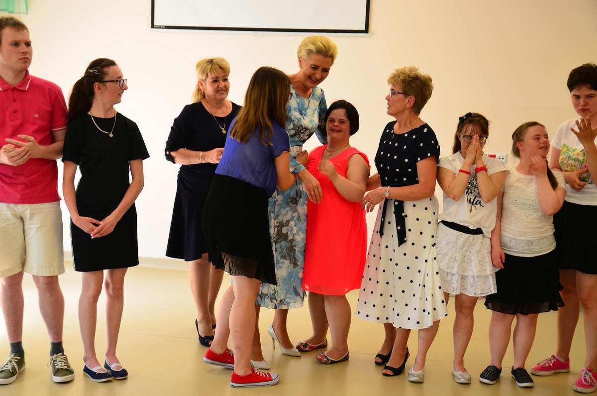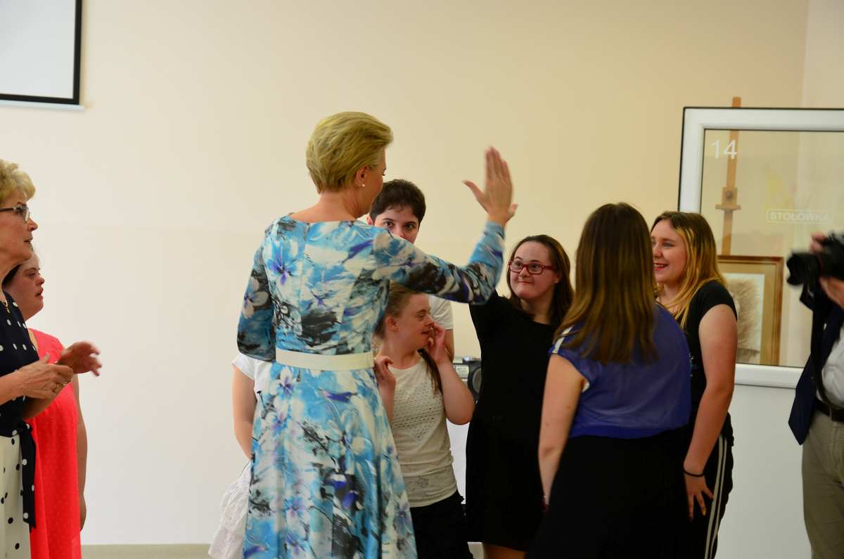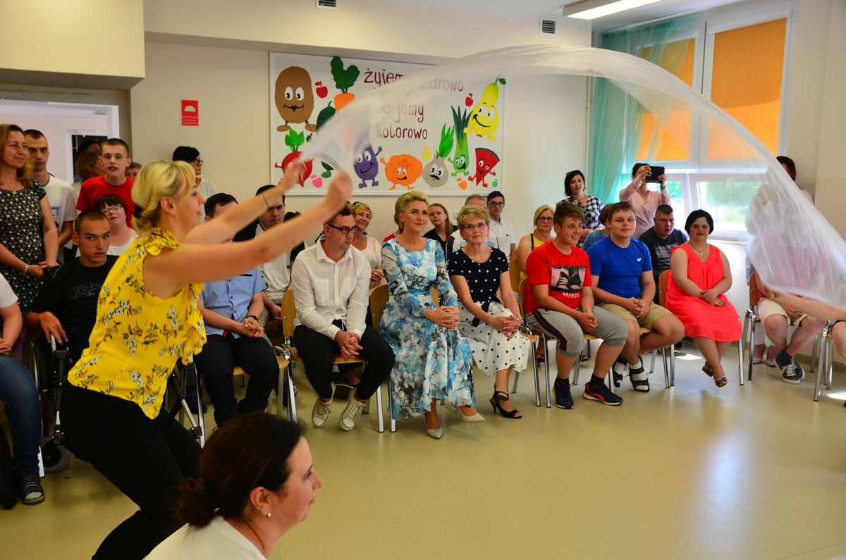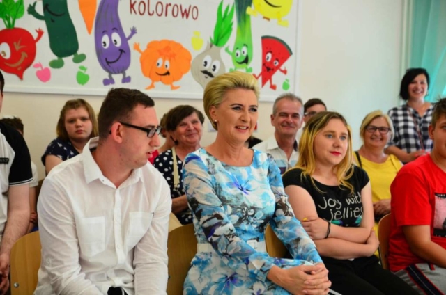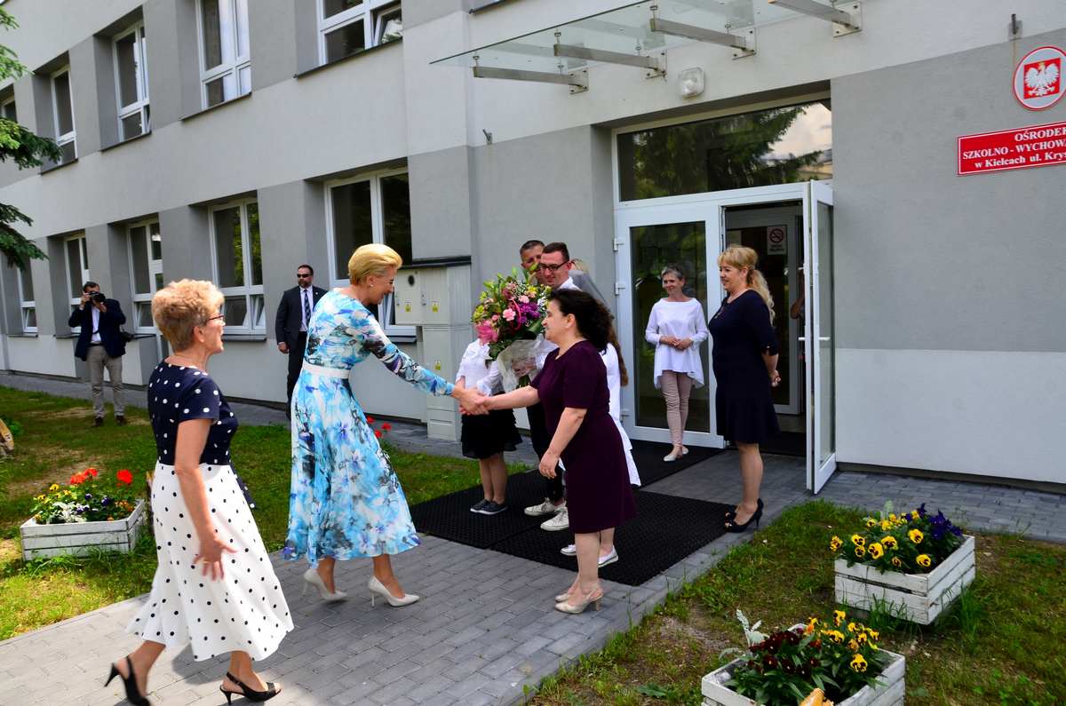 Około południa pani dyrektor Kazimiera Nowak w asyście uczniów powitała Panią Prezydentową w murach naszej placówki. Następnie młodzież zaprezentowała przygotowany wcześniej układ taneczno – muzyczny. Po serdecznym odbiorze występu uczniów przez Panią Prezydentową, cały bieg wydarzeń wymknął się spod ustalonego scenariusza. Młodzież z całym zaangażowaniem i wrodzoną spontanicznością, oprowadziła znamienitego Gościa po naszym Ośrodku rozmawiając o swoich pasjach, ulubionych zajęciach, słuchaniu muzyki, kulinariach, a nawet sadze „Gwiezdne wojny”. Pani Prezydentowa Agata Kornhauser – Duda ze znakomitym skutkiem wzięła czynny udział w zajęciach plastycznych malowania majowej łąki i rękodzielniczych, w czasie których wykonała z młodzieżą piękną glinianą broszkę. Była również okazja do rozmów z rodzicami, nauczycielami i pracownikami Ośrodka, a nawet znalazł się czas na taniec podczas krótkiej dyskoteki szkolnej.