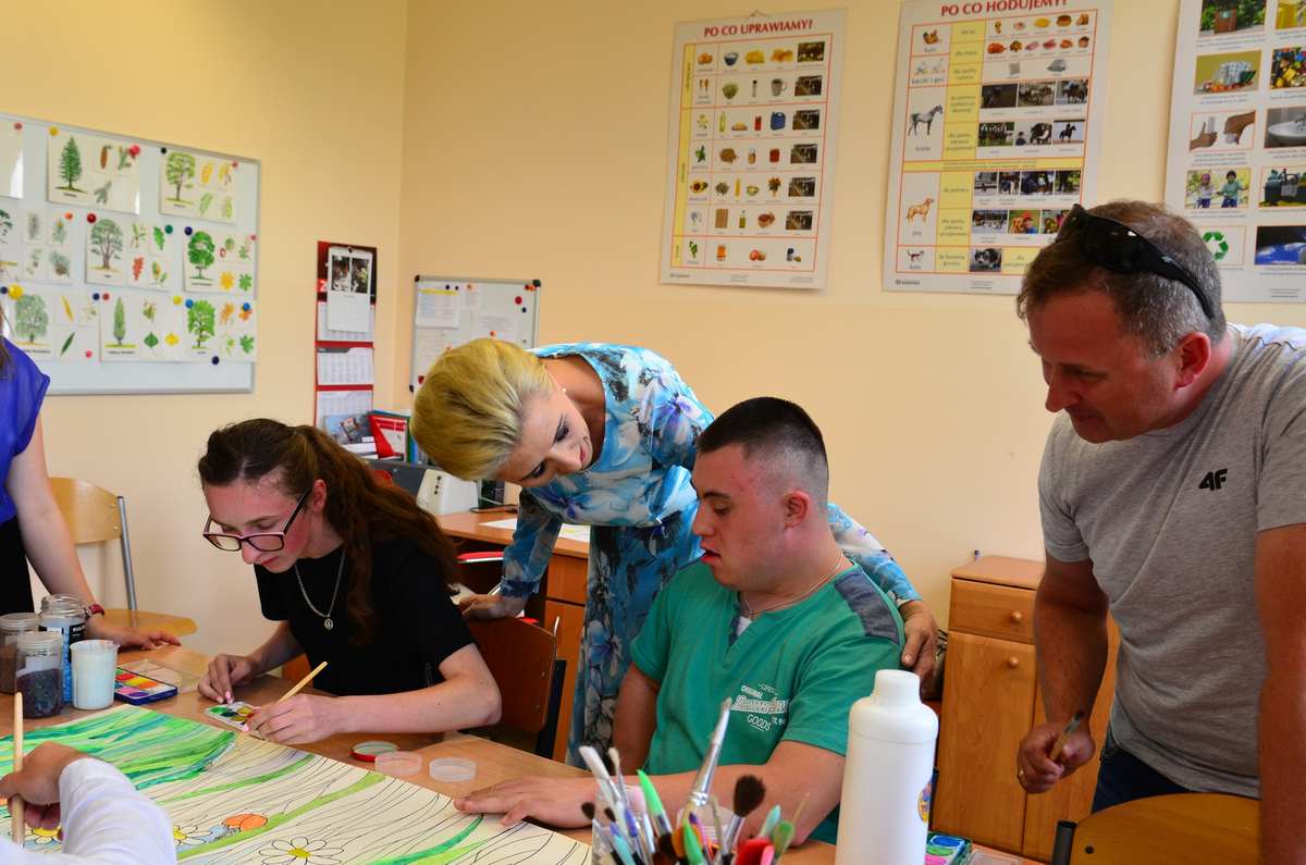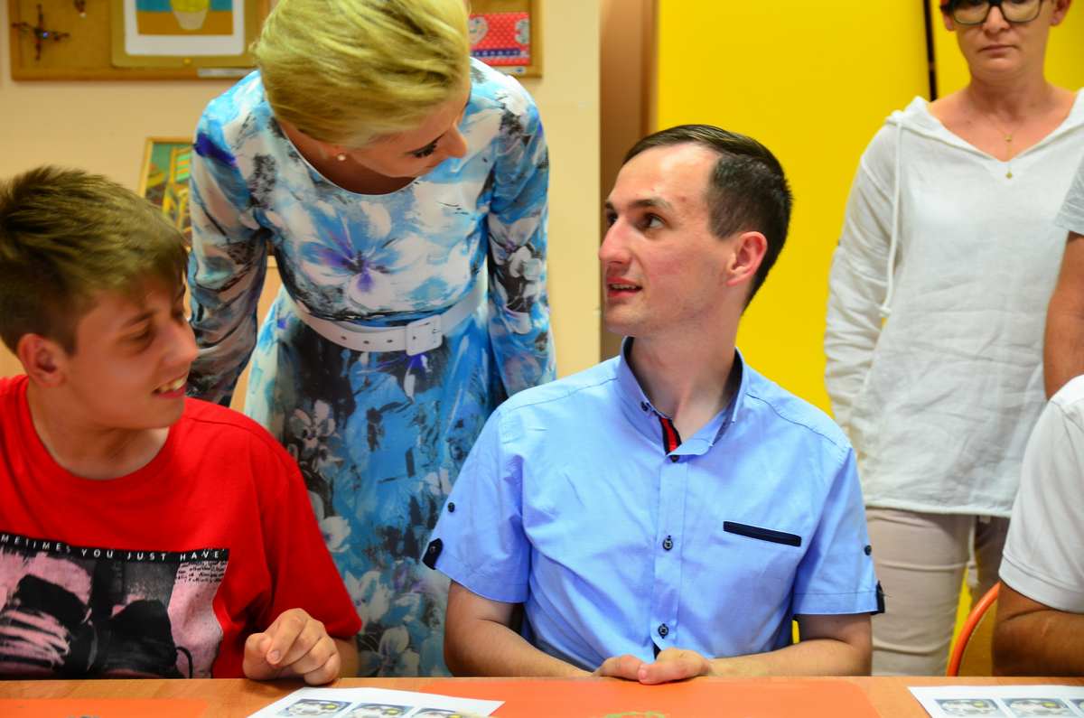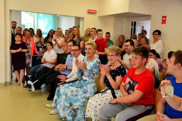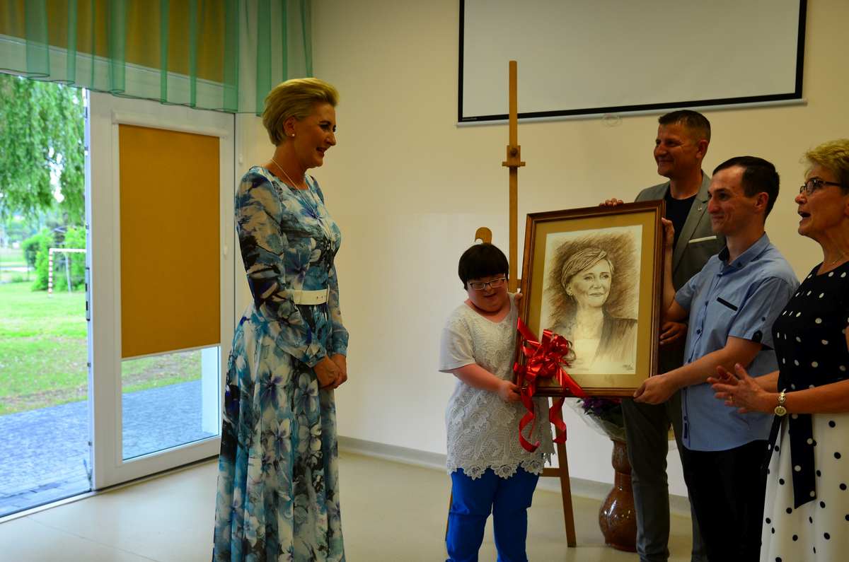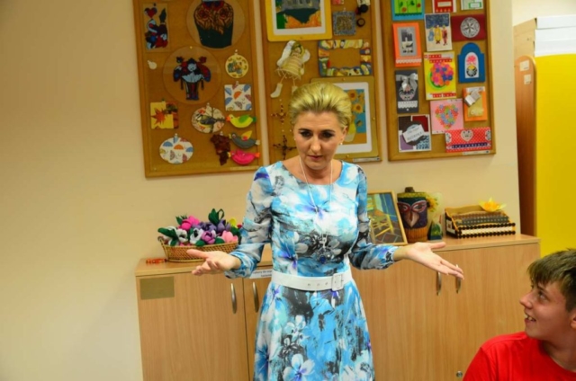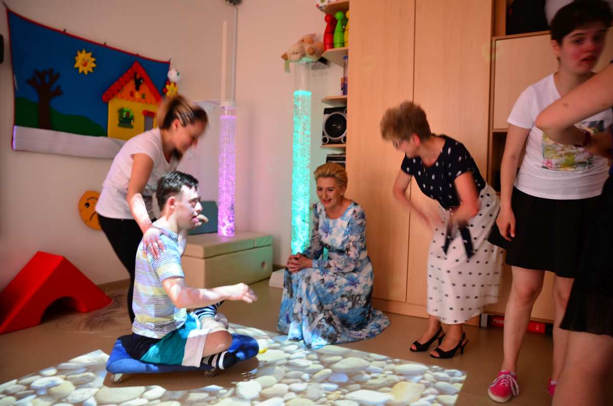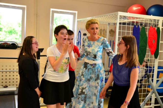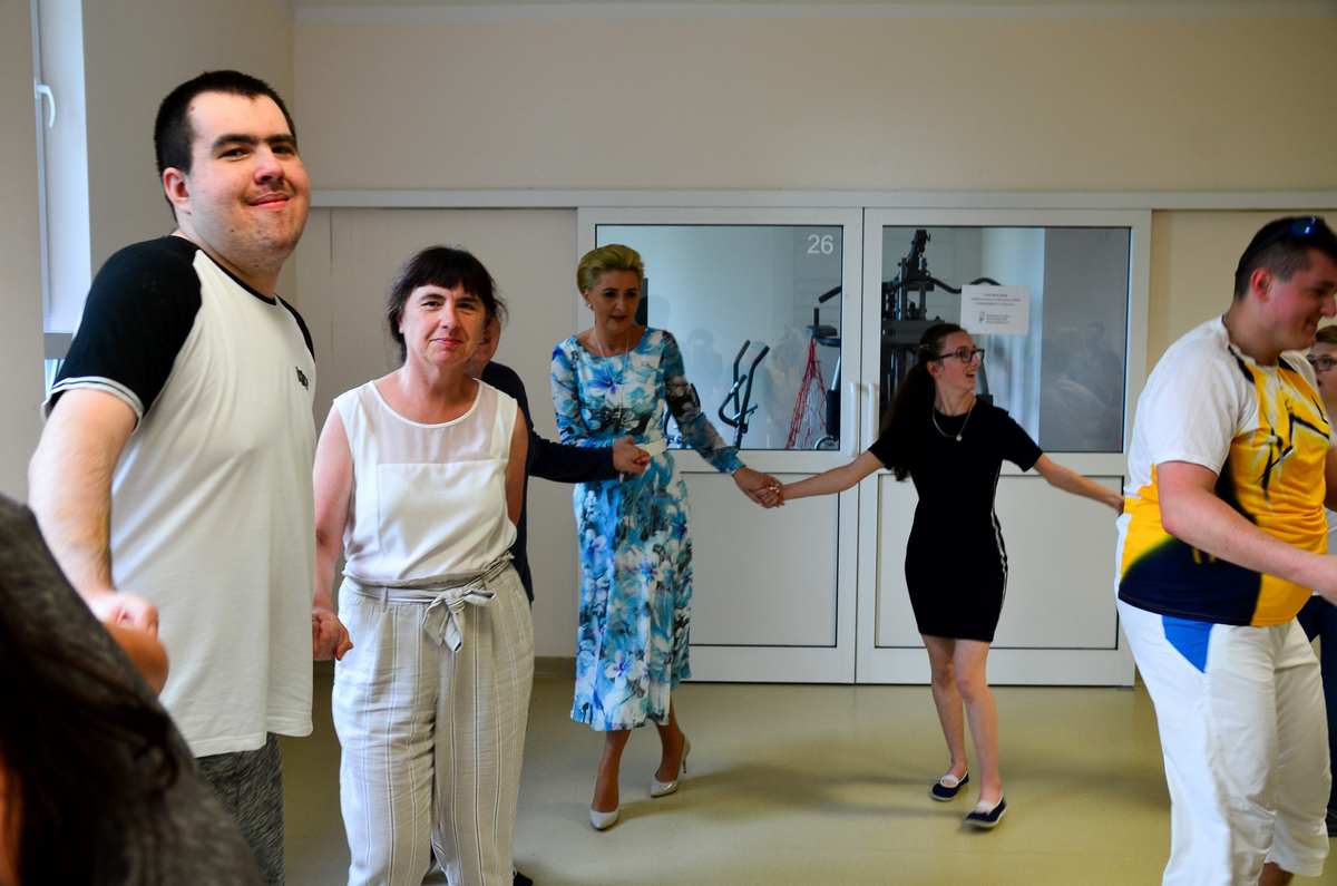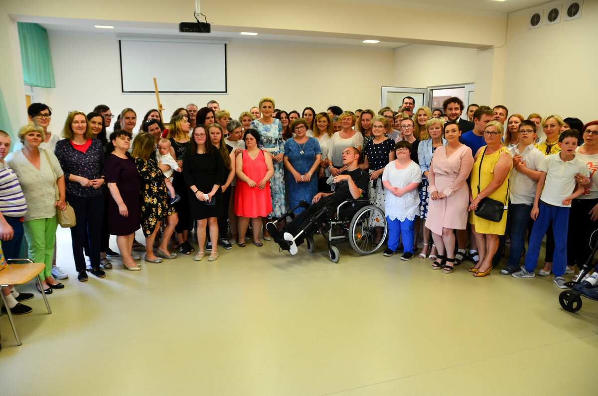 Około południa pani dyrektor Kazimiera Nowak w asyście uczniów powitała Panią Prezydentową w murach naszej placówki. Następnie młodzież zaprezentowała przygotowany wcześniej układ taneczno – muzyczny. Po serdecznym odbiorze występu uczniów przez Panią Prezydentową, cały bieg wydarzeń wymknął się spod ustalonego scenariusza. Młodzież z całym zaangażowaniem i wrodzoną spontanicznością, oprowadziła znamienitego Gościa po naszym Ośrodku rozmawiając o swoich pasjach, ulubionych zajęciach, słuchaniu muzyki, kulinariach, a nawet sadze „Gwiezdne wojny”. Pani Prezydentowa Agata Kornhauser – Duda ze znakomitym skutkiem wzięła czynny udział w zajęciach plastycznych malowania majowej łąki i rękodzielniczych, w czasie których wykonała z młodzieżą piękną glinianą broszkę. Była również okazja do rozmów z rodzicami, nauczycielami i pracownikami Ośrodka, a nawet znalazł się czas na taniec podczas krótkiej dyskoteki szkolnej.