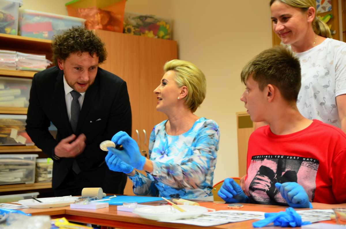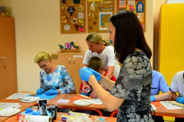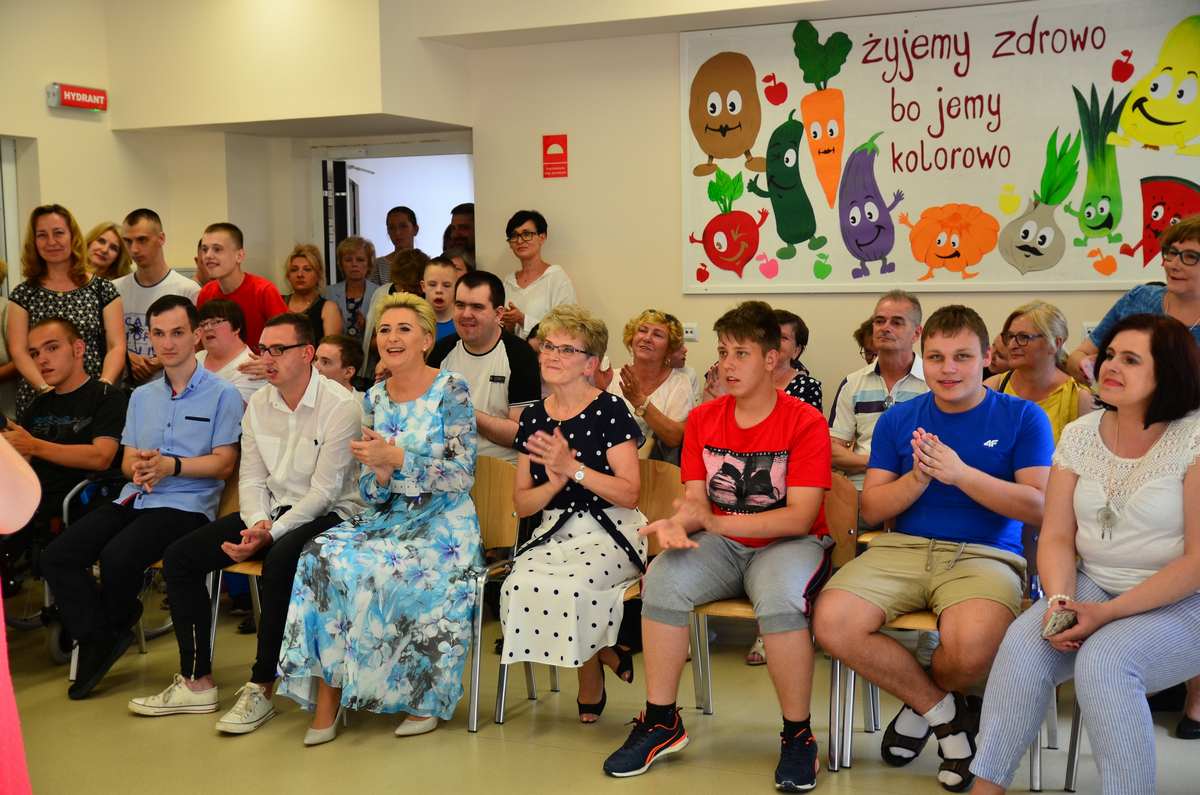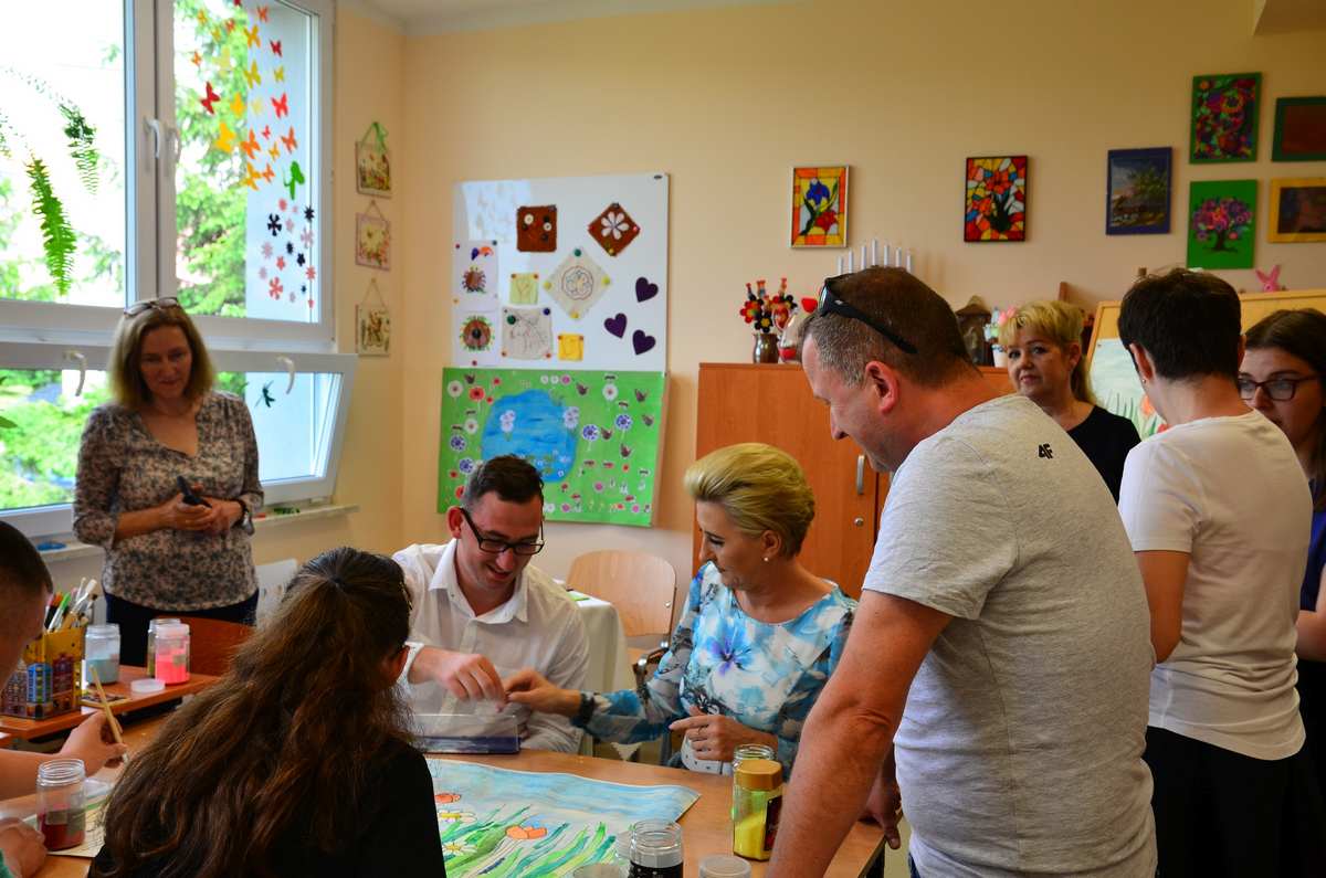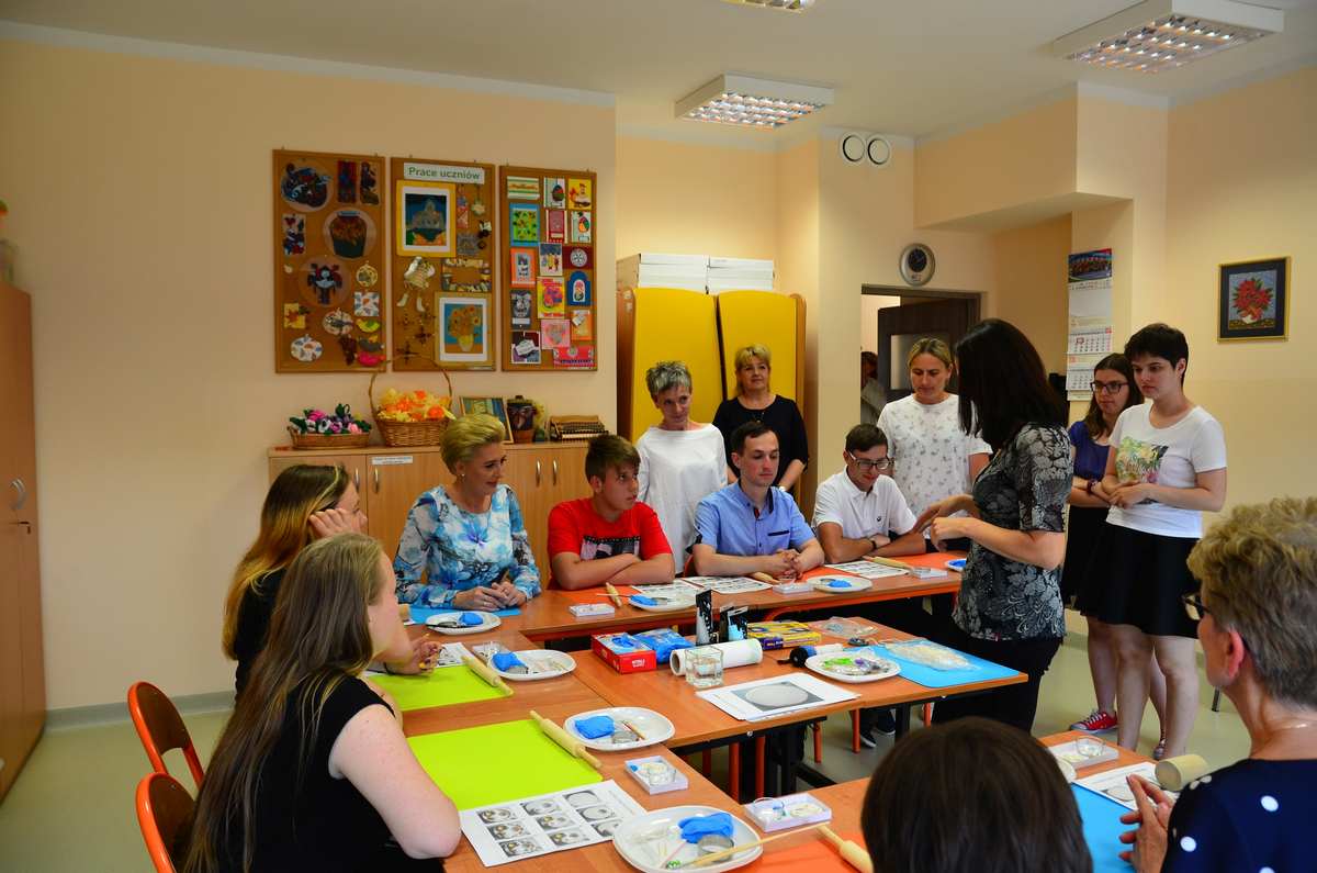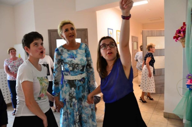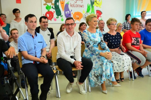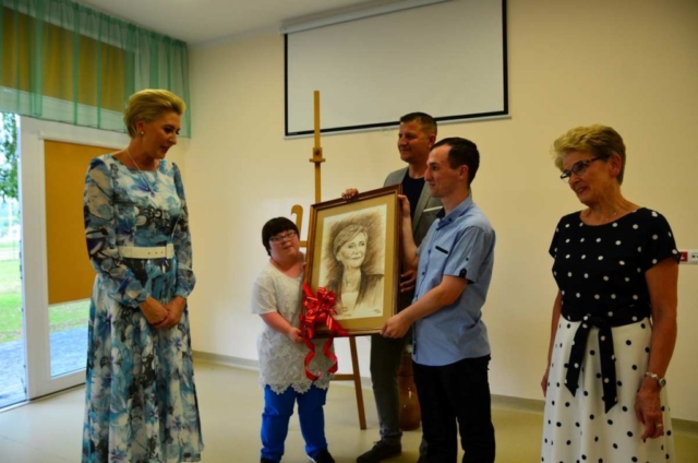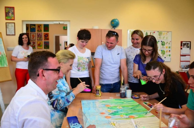 Około południa pani dyrektor Kazimiera Nowak w asyście uczniów powitała Panią Prezydentową w murach naszej placówki. Następnie młodzież zaprezentowała przygotowany wcześniej układ taneczno – muzyczny. Po serdecznym odbiorze występu uczniów przez Panią Prezydentową, cały bieg wydarzeń wymknął się spod ustalonego scenariusza. Młodzież z całym zaangażowaniem i wrodzoną spontanicznością, oprowadziła znamienitego Gościa po naszym Ośrodku rozmawiając o swoich pasjach, ulubionych zajęciach, słuchaniu muzyki, kulinariach, a nawet sadze „Gwiezdne wojny”. Pani Prezydentowa Agata Kornhauser – Duda ze znakomitym skutkiem wzięła czynny udział w zajęciach plastycznych malowania majowej łąki i rękodzielniczych, w czasie których wykonała z młodzieżą piękną glinianą broszkę. Była również okazja do rozmów z rodzicami, nauczycielami i pracownikami Ośrodka, a nawet znalazł się czas na taniec podczas krótkiej dyskoteki szkolnej.