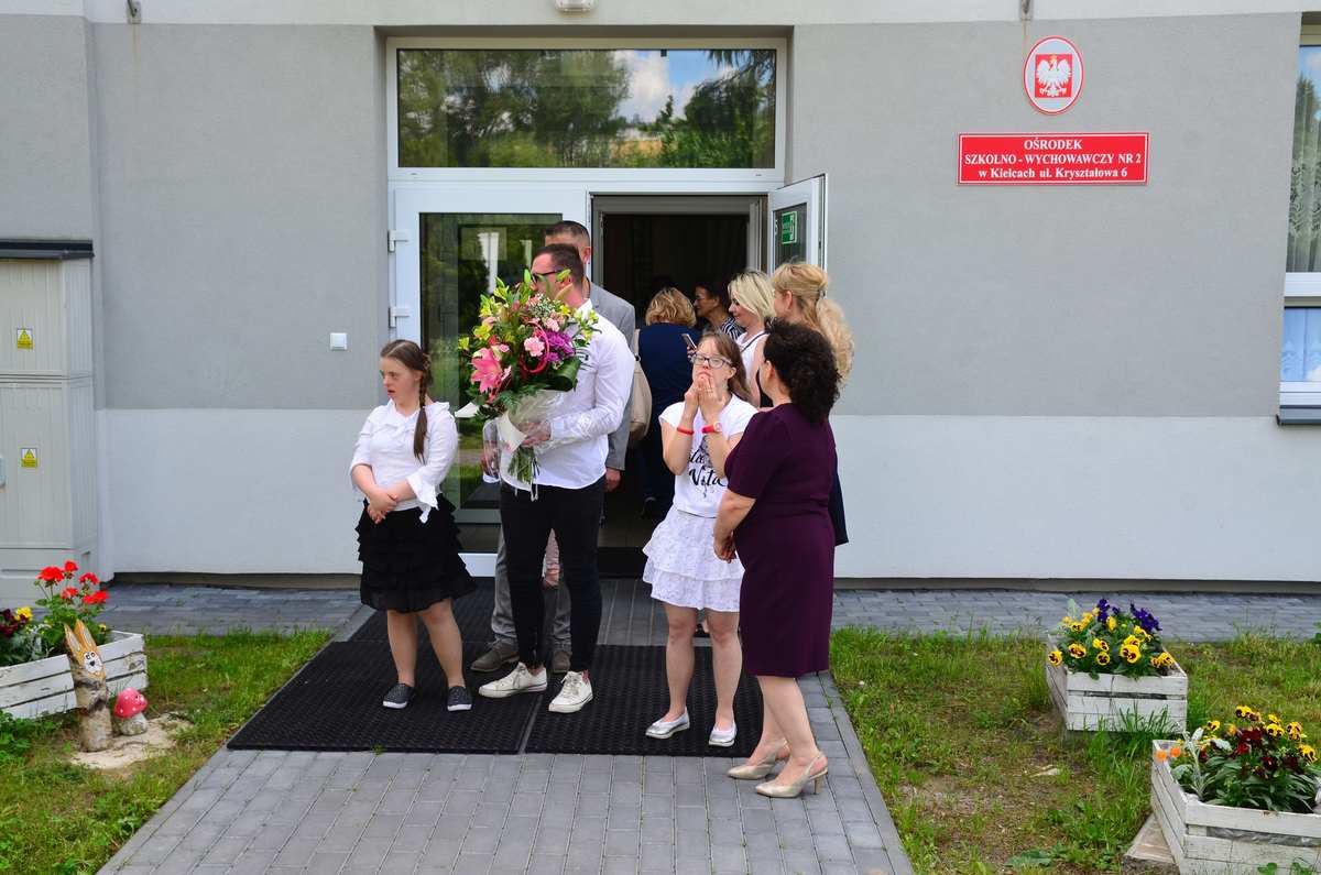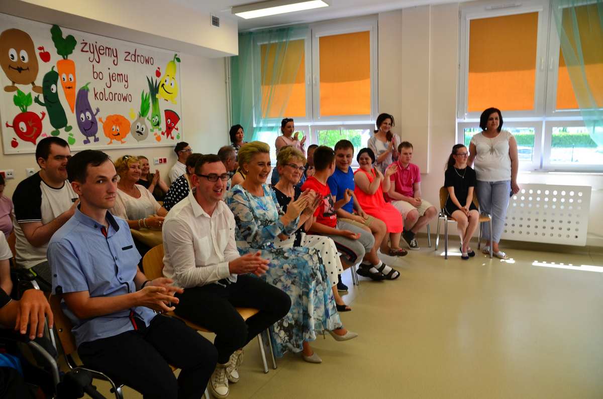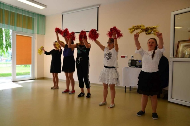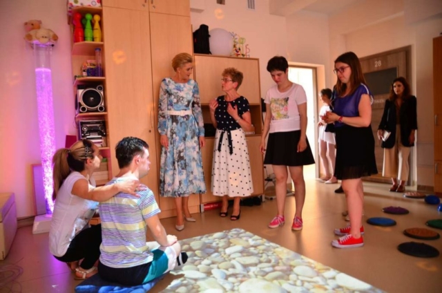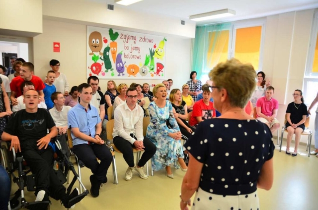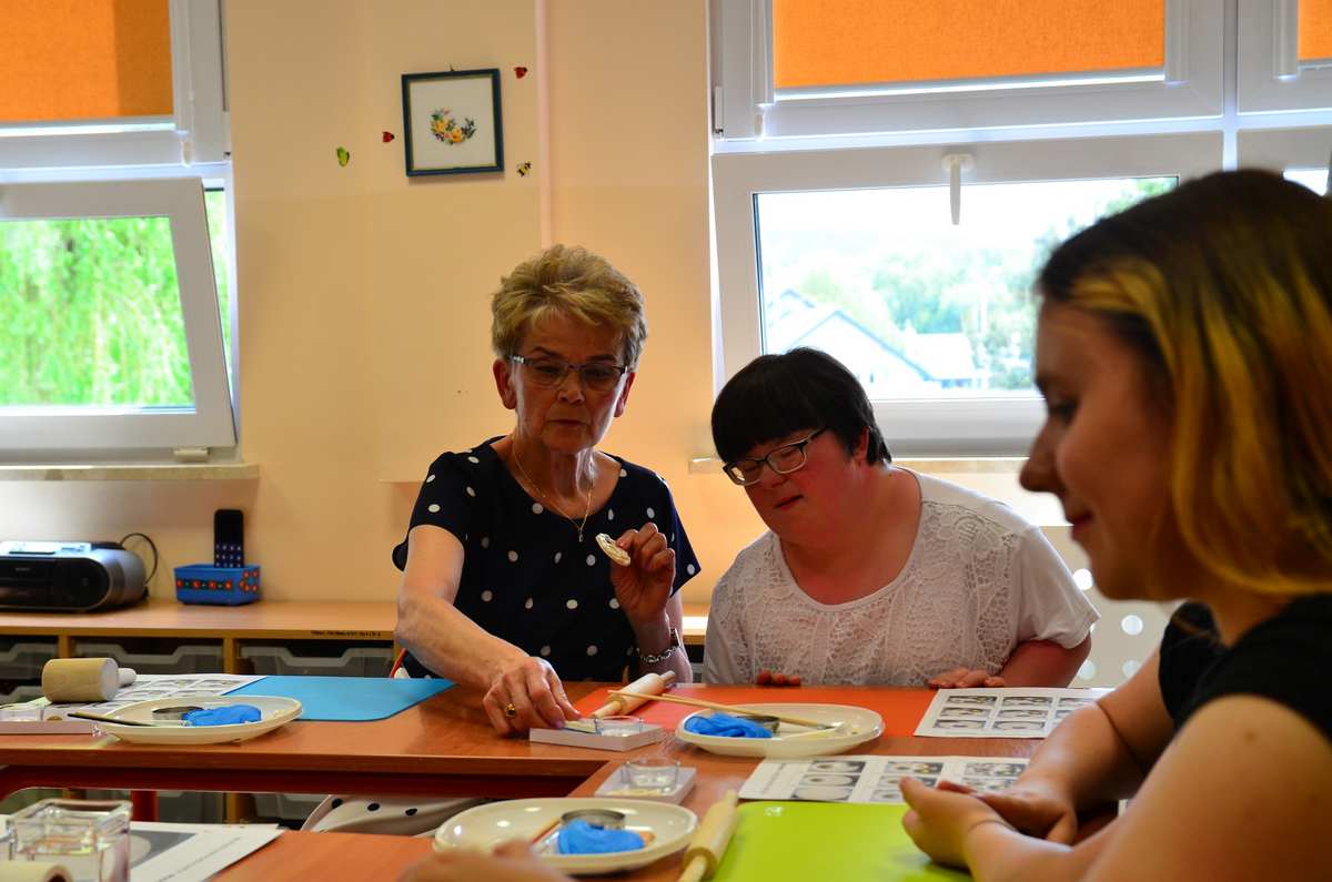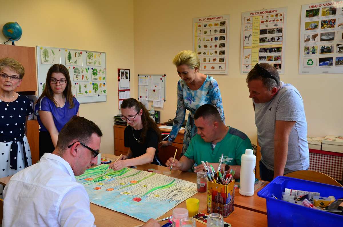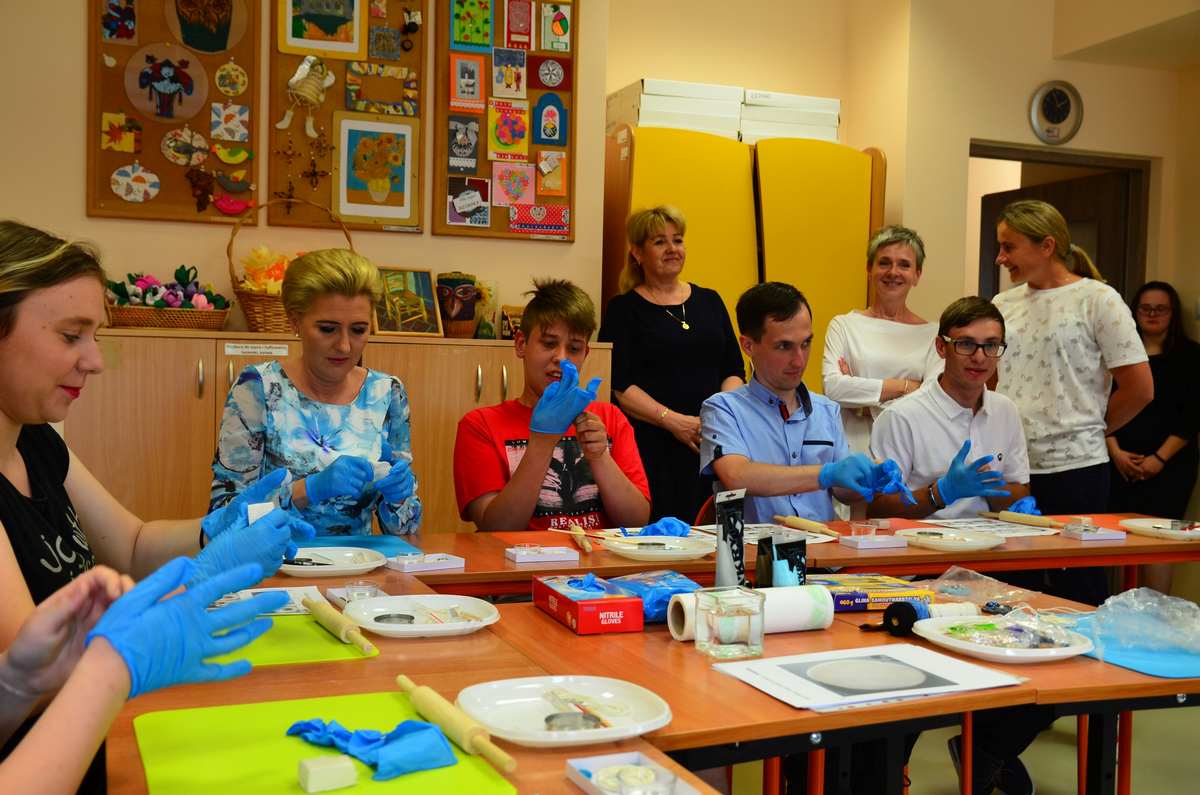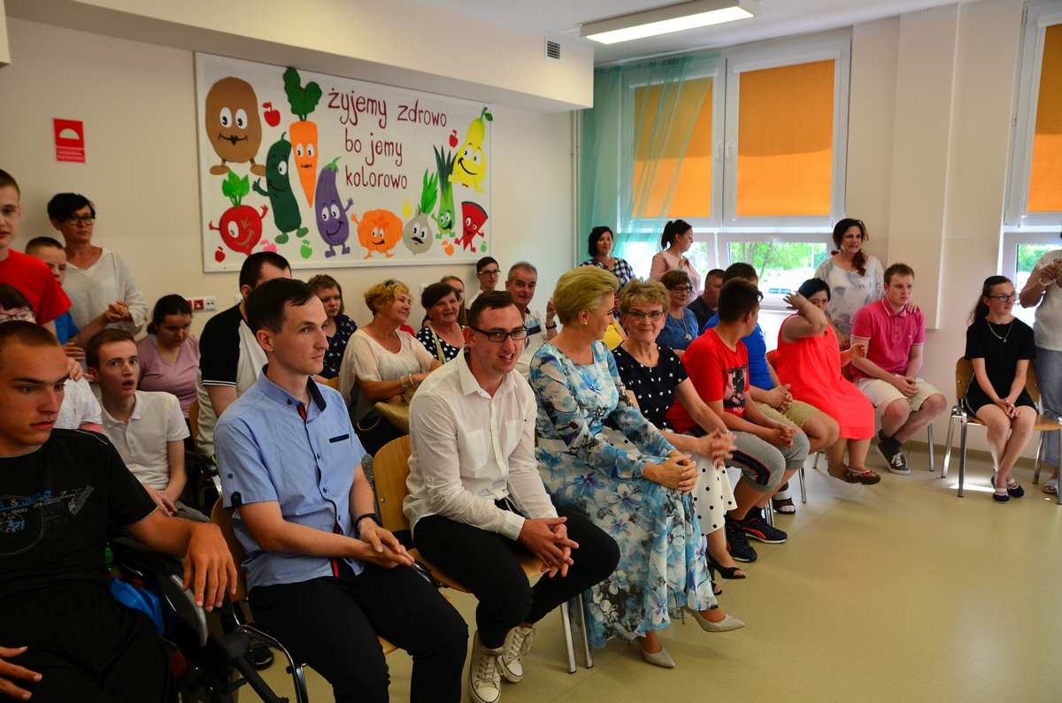 Około południa pani dyrektor Kazimiera Nowak w asyście uczniów powitała Panią Prezydentową w murach naszej placówki. Następnie młodzież zaprezentowała przygotowany wcześniej układ taneczno – muzyczny. Po serdecznym odbiorze występu uczniów przez Panią Prezydentową, cały bieg wydarzeń wymknął się spod ustalonego scenariusza. Młodzież z całym zaangażowaniem i wrodzoną spontanicznością, oprowadziła znamienitego Gościa po naszym Ośrodku rozmawiając o swoich pasjach, ulubionych zajęciach, słuchaniu muzyki, kulinariach, a nawet sadze „Gwiezdne wojny”. Pani Prezydentowa Agata Kornhauser – Duda ze znakomitym skutkiem wzięła czynny udział w zajęciach plastycznych malowania majowej łąki i rękodzielniczych, w czasie których wykonała z młodzieżą piękną glinianą broszkę. Była również okazja do rozmów z rodzicami, nauczycielami i pracownikami Ośrodka, a nawet znalazł się czas na taniec podczas krótkiej dyskoteki szkolnej.