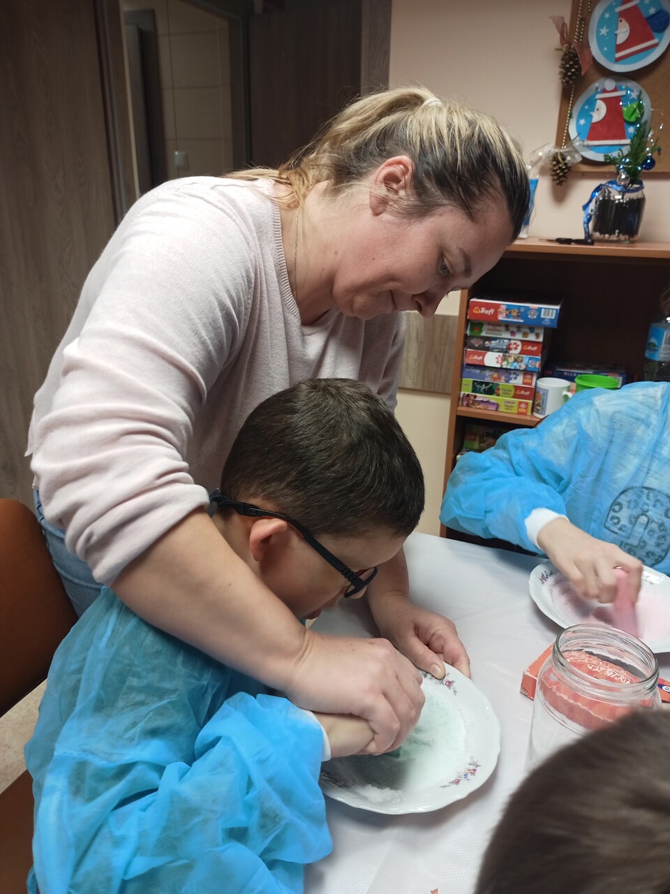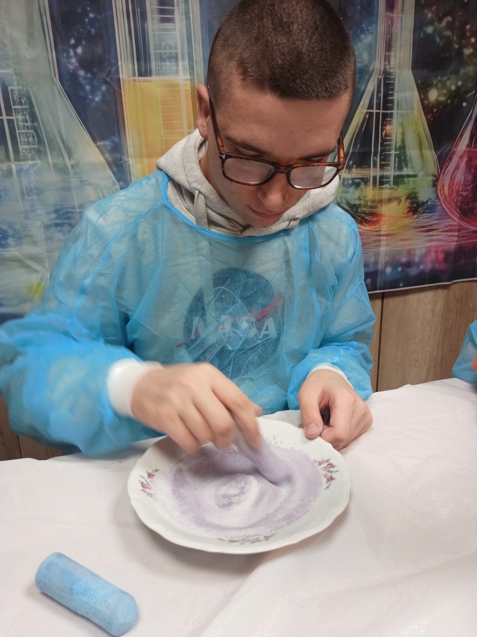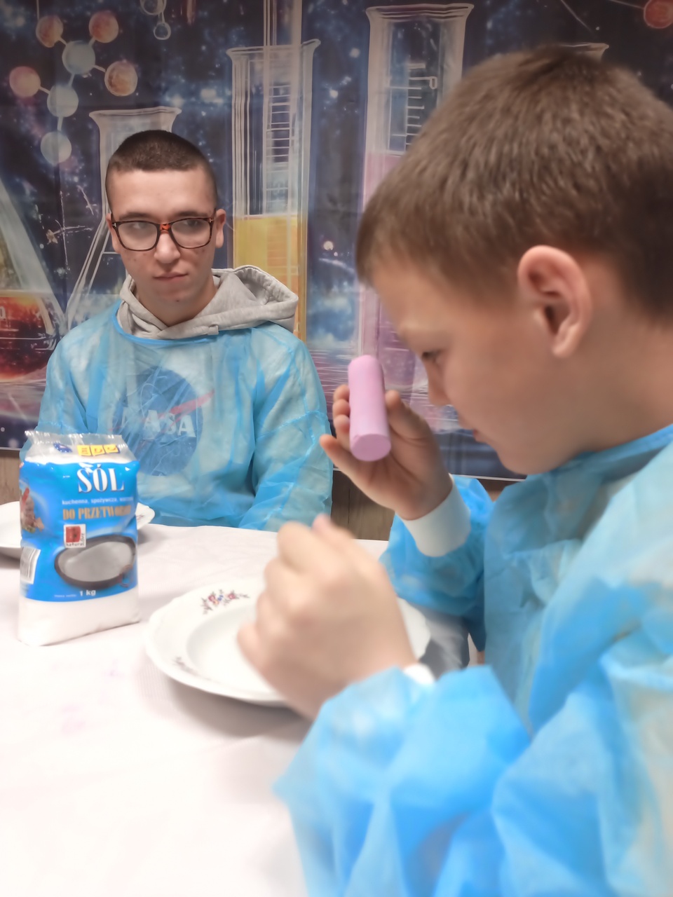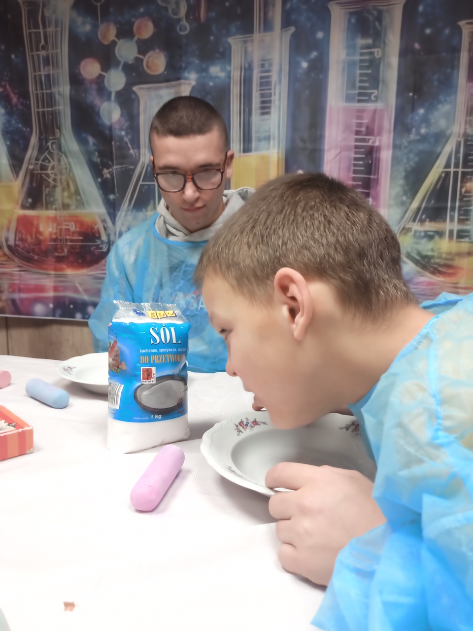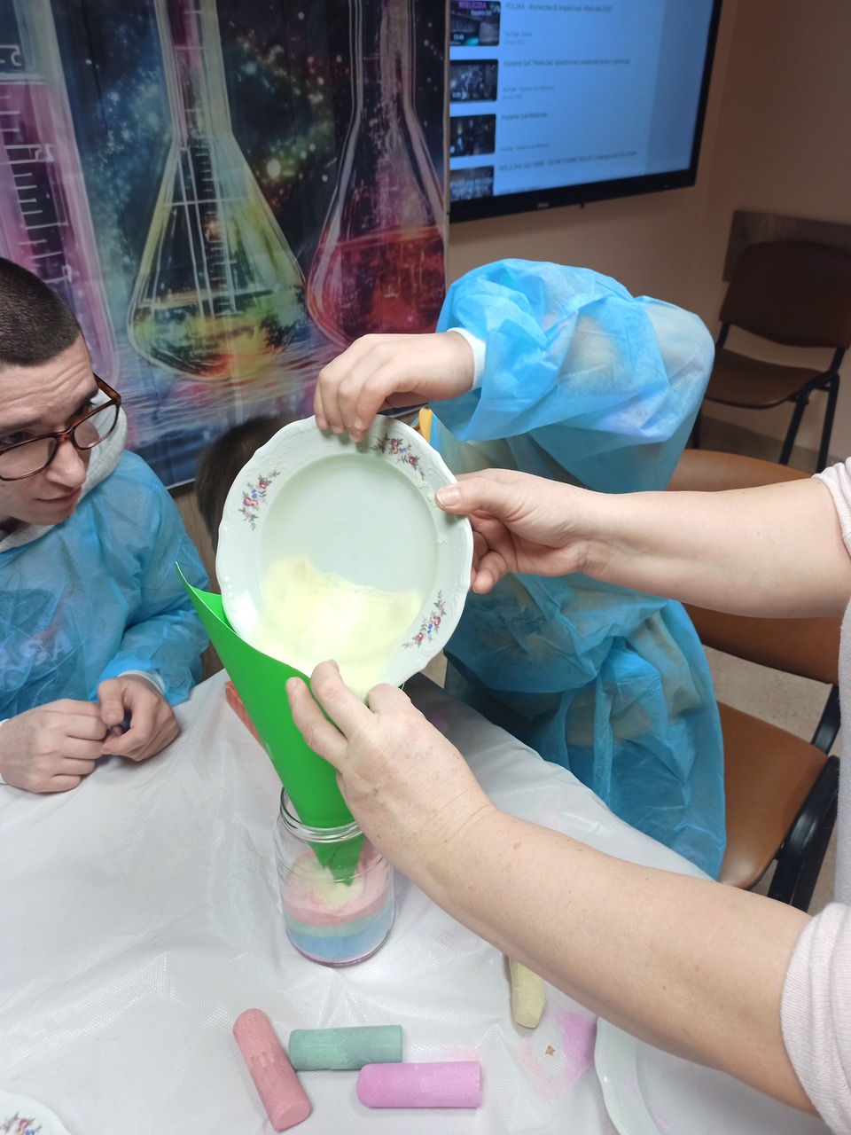 Przyszedł czas na kolejne ekserymenty… tym razem wychowankowie zajęli się barwieniem soli. Do wykonania tego zadania potrzebne były jedynie słoiczki oraz kolorowa kreda i trochę ruchu dłonią. Wychowankowie byli zaskoczeni jak stopniowo sól zmienia się z koloru białego na kolor kredy. Powstały nam piękne kolory: żółty, niebieski, zielony, różowy i fioletowy. Było to proste ale bardzo efektowne i atrakcyjne zadanie. Zabarwioną sól na pewno wykorzystamy w pracach plastcznych.