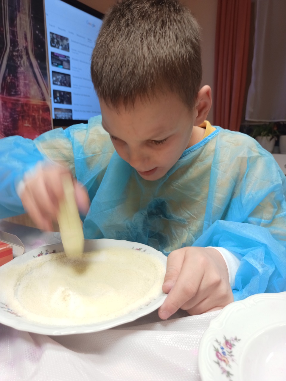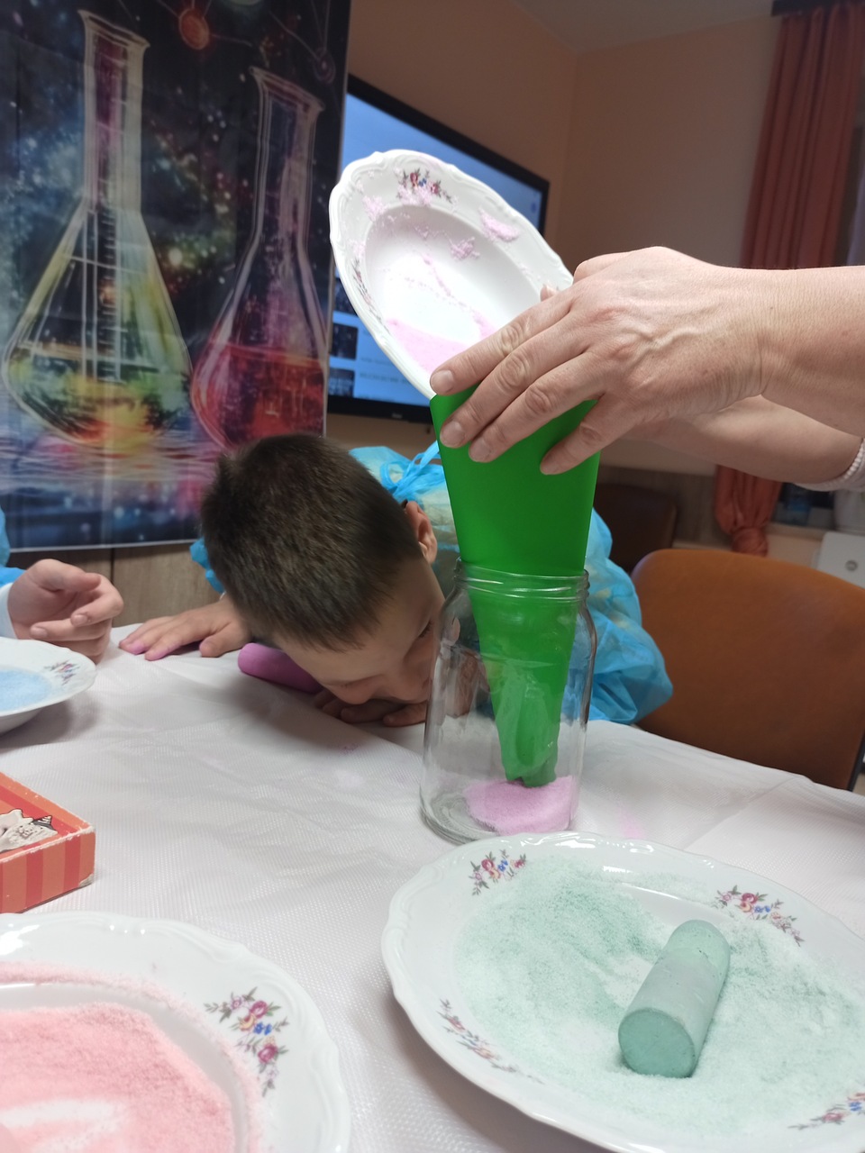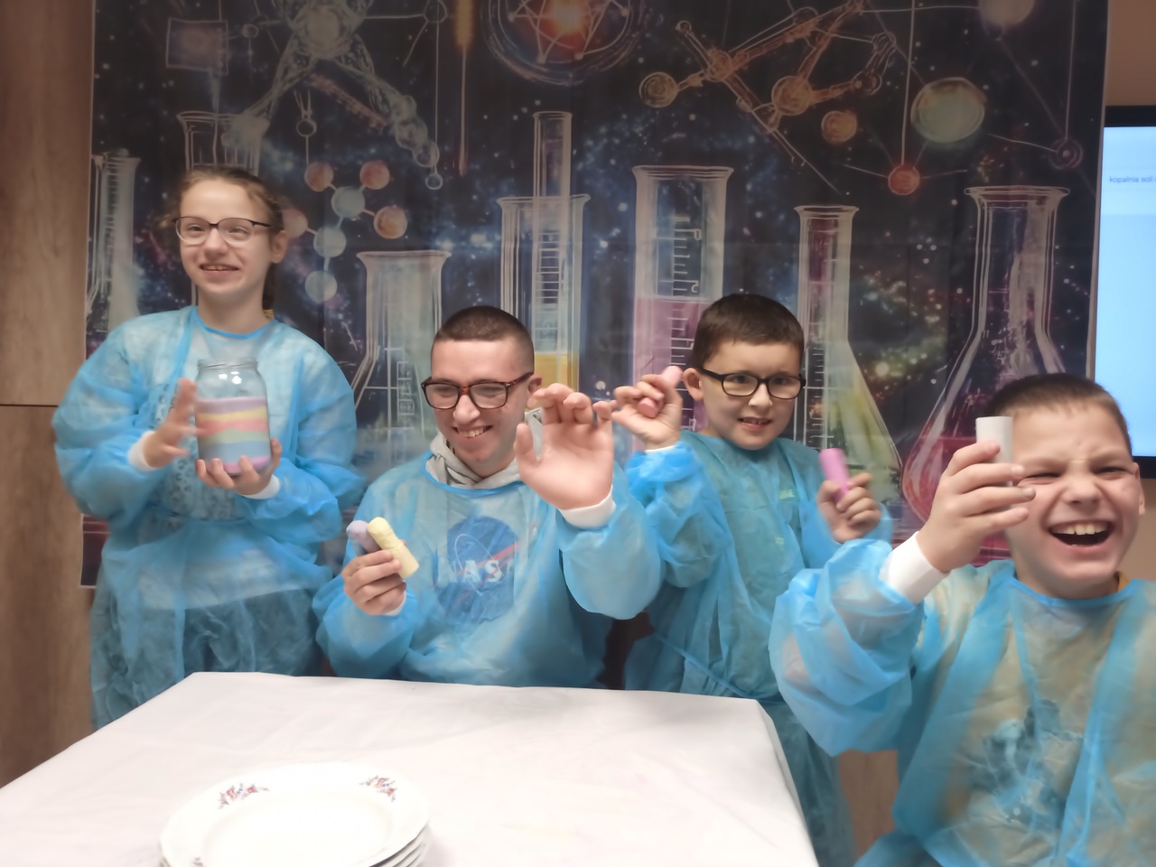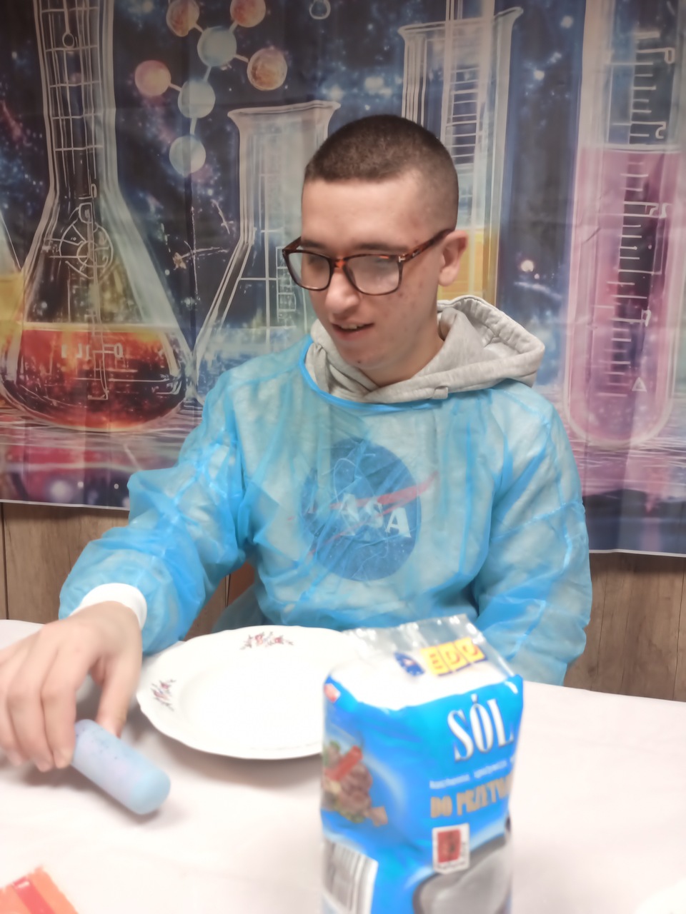 Przyszedł czas na kolejne ekserymenty… tym razem wychowankowie zajęli się barwieniem soli. Do wykonania tego zadania potrzebne były jedynie słoiczki oraz kolorowa kreda i trochę ruchu dłonią. Wychowankowie byli zaskoczeni jak stopniowo sól zmienia się z koloru białego na kolor kredy. Powstały nam piękne kolory: żółty, niebieski, zielony, różowy i fioletowy. Było to proste ale bardzo efektowne i atrakcyjne zadanie. Zabarwioną sól na pewno wykorzystamy w pracach plastcznych.