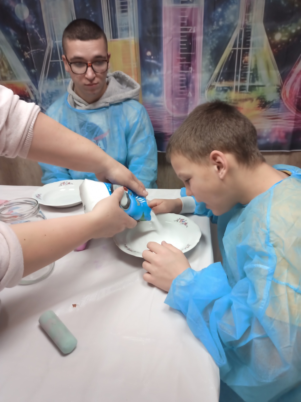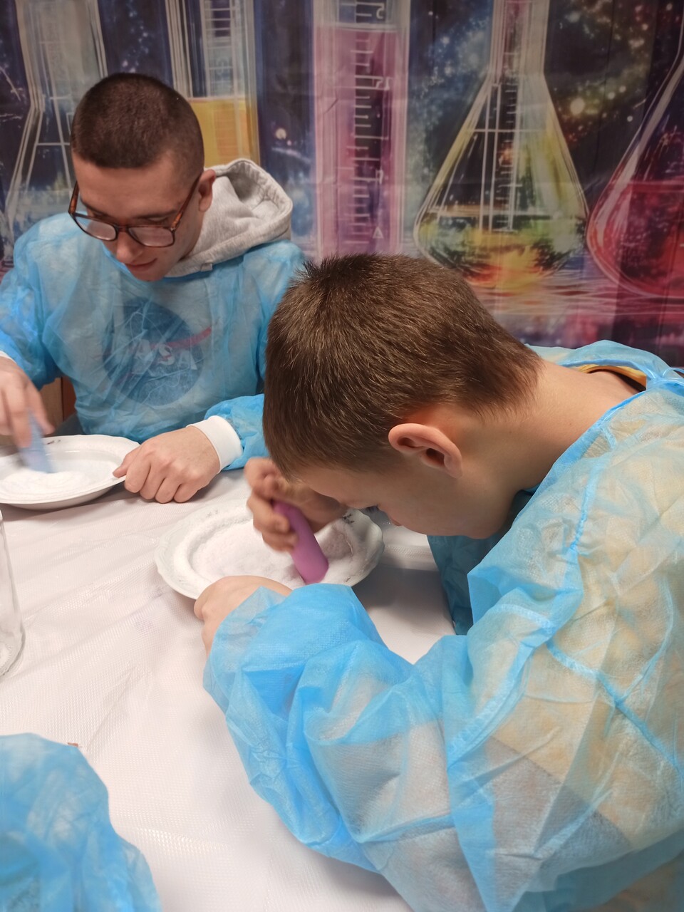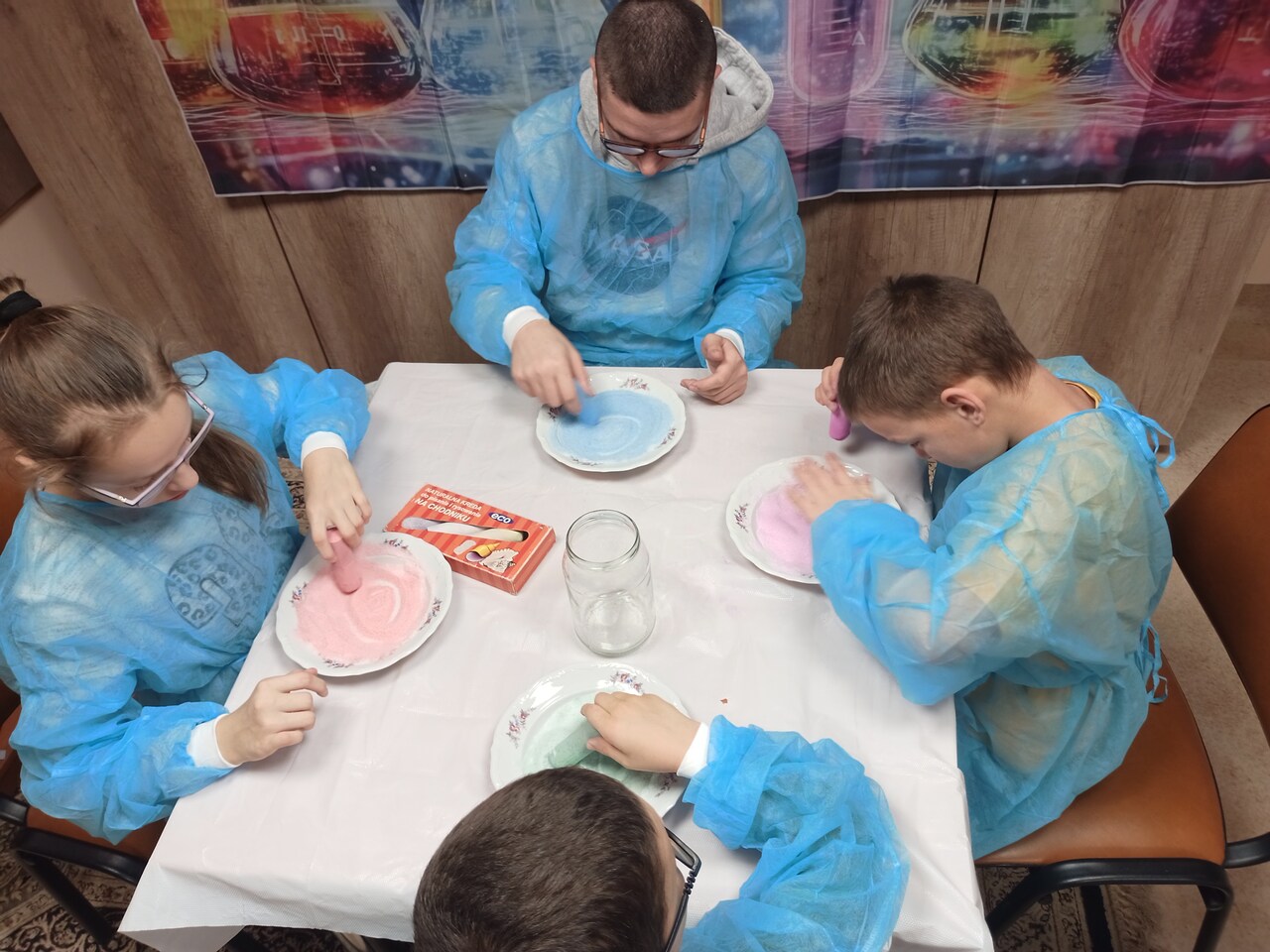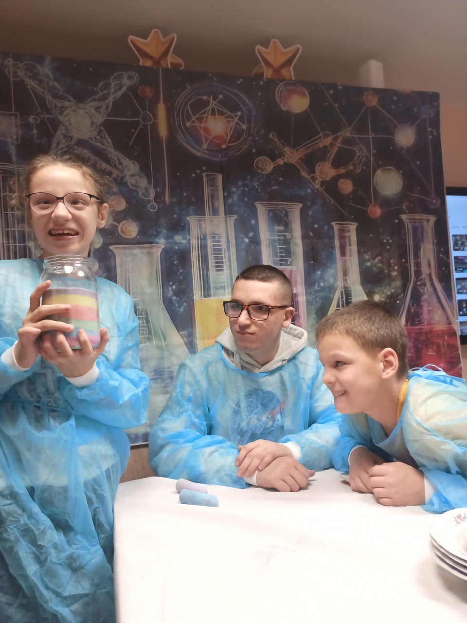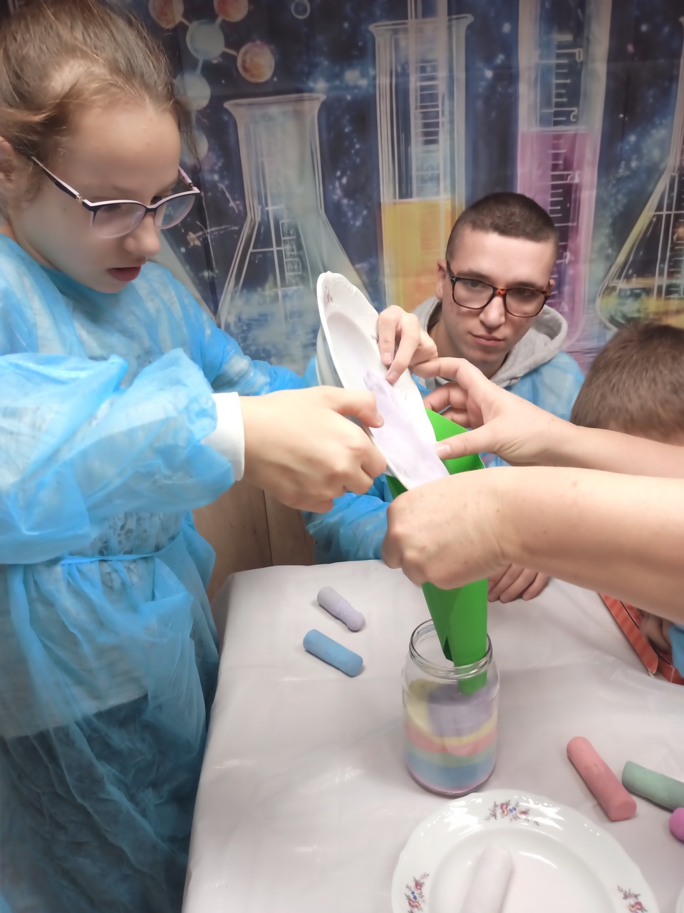 Przyszedł czas na kolejne ekserymenty… tym razem wychowankowie zajęli się barwieniem soli. Do wykonania tego zadania potrzebne były jedynie słoiczki oraz kolorowa kreda i trochę ruchu dłonią. Wychowankowie byli zaskoczeni jak stopniowo sól zmienia się z koloru białego na kolor kredy. Powstały nam piękne kolory: żółty, niebieski, zielony, różowy i fioletowy. Było to proste ale bardzo efektowne i atrakcyjne zadanie. Zabarwioną sól na pewno wykorzystamy w pracach plastcznych.