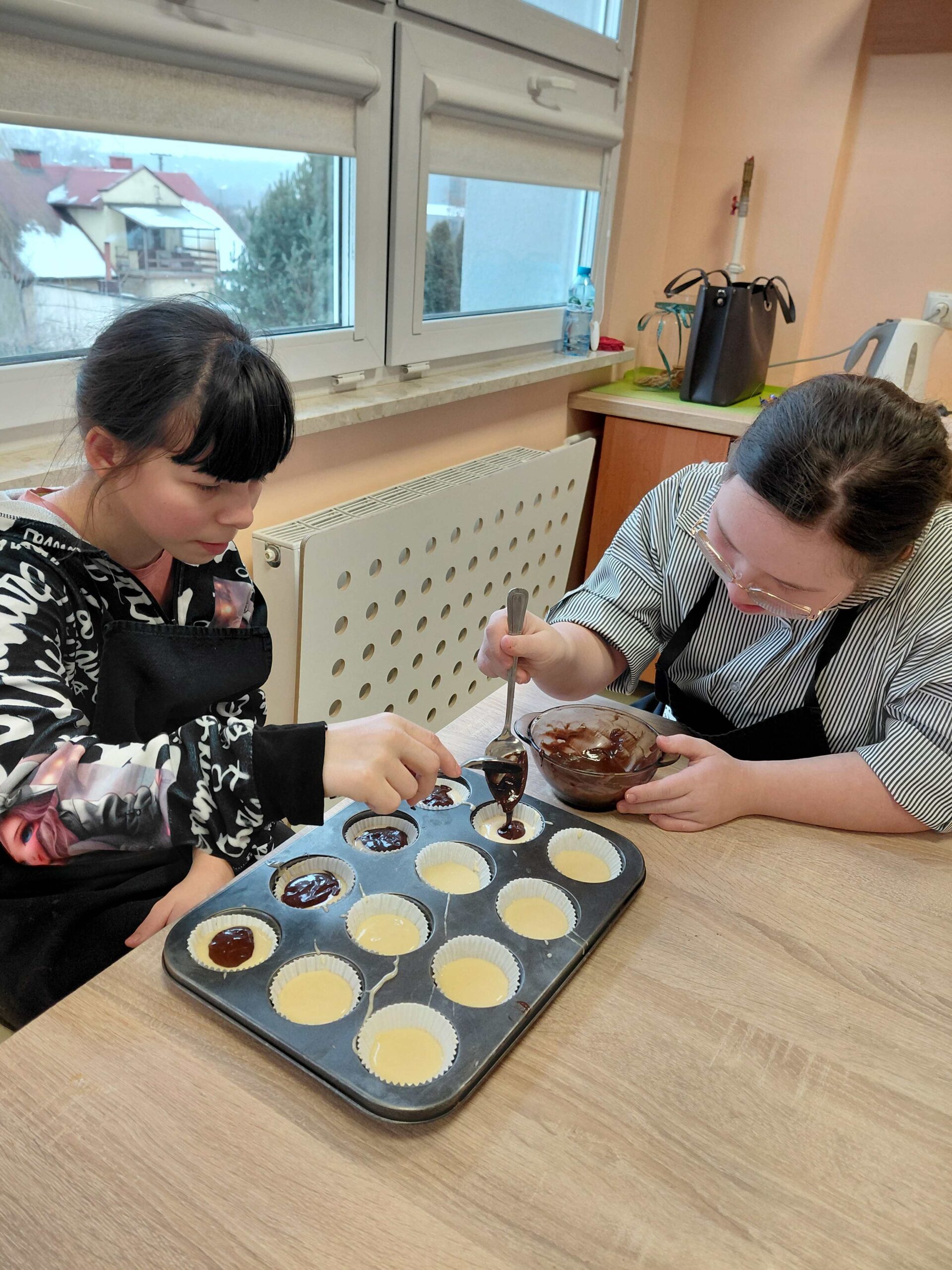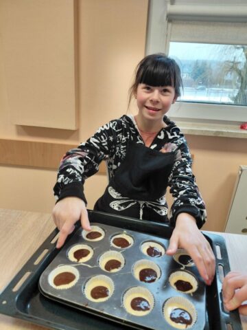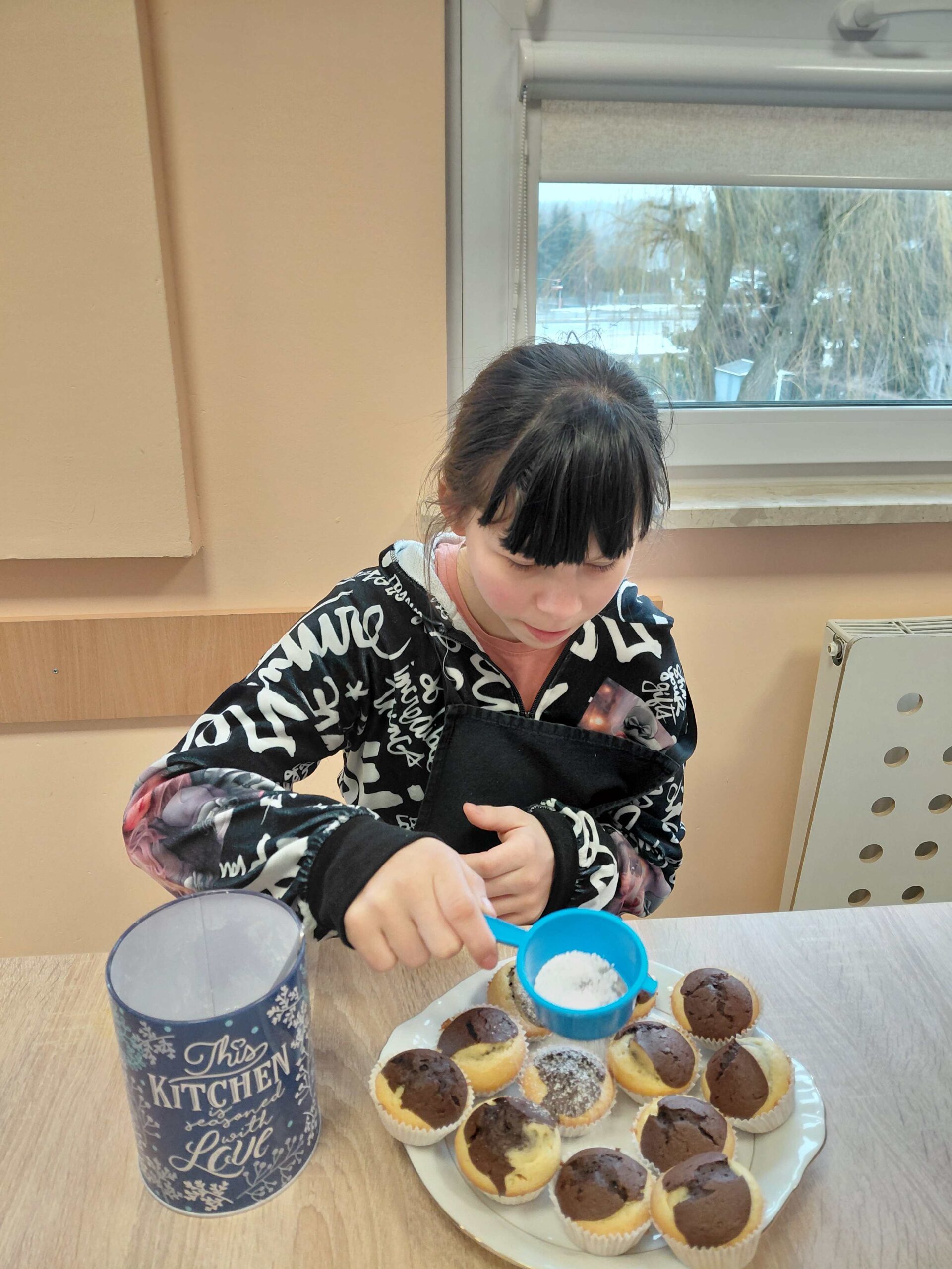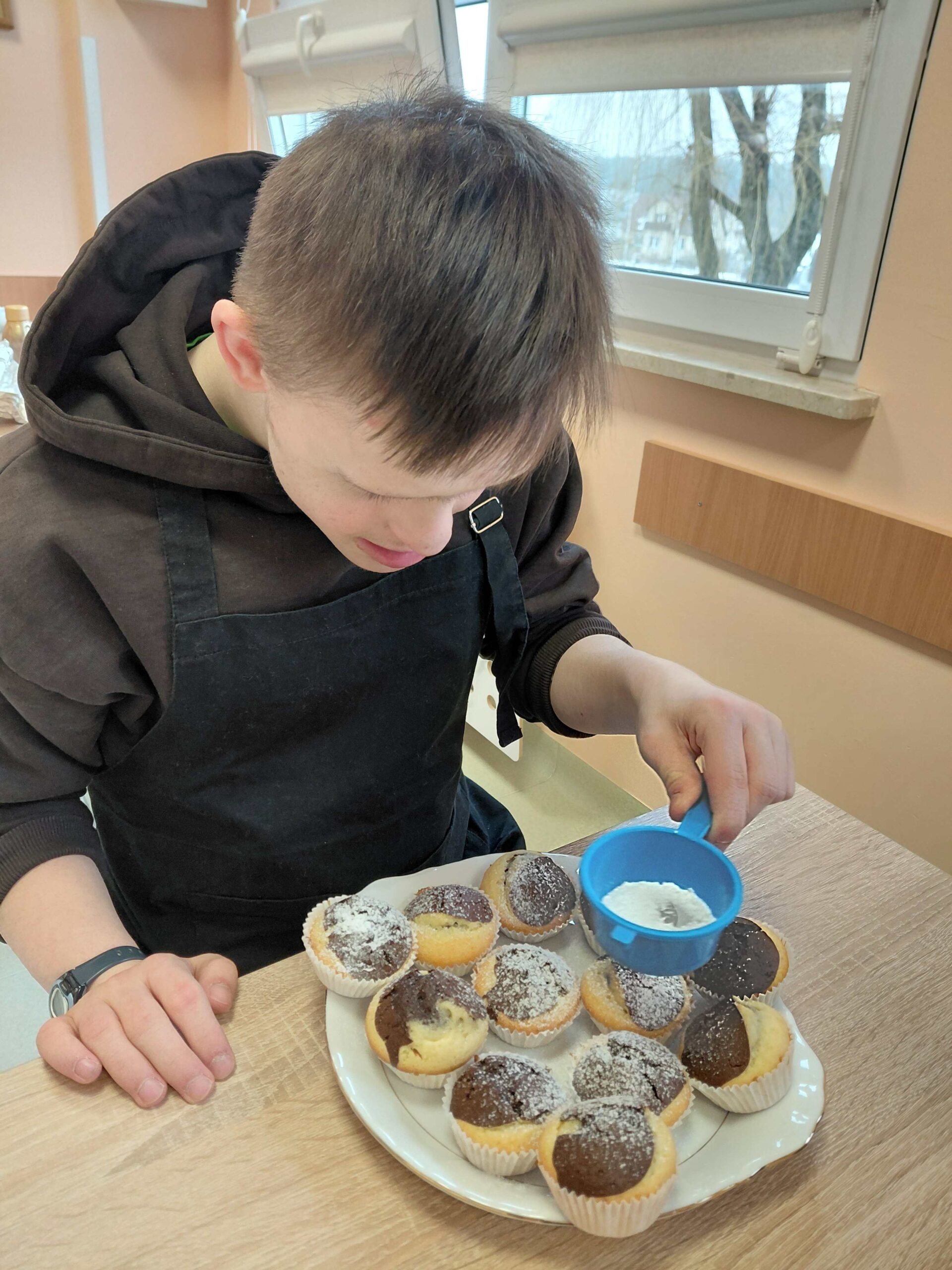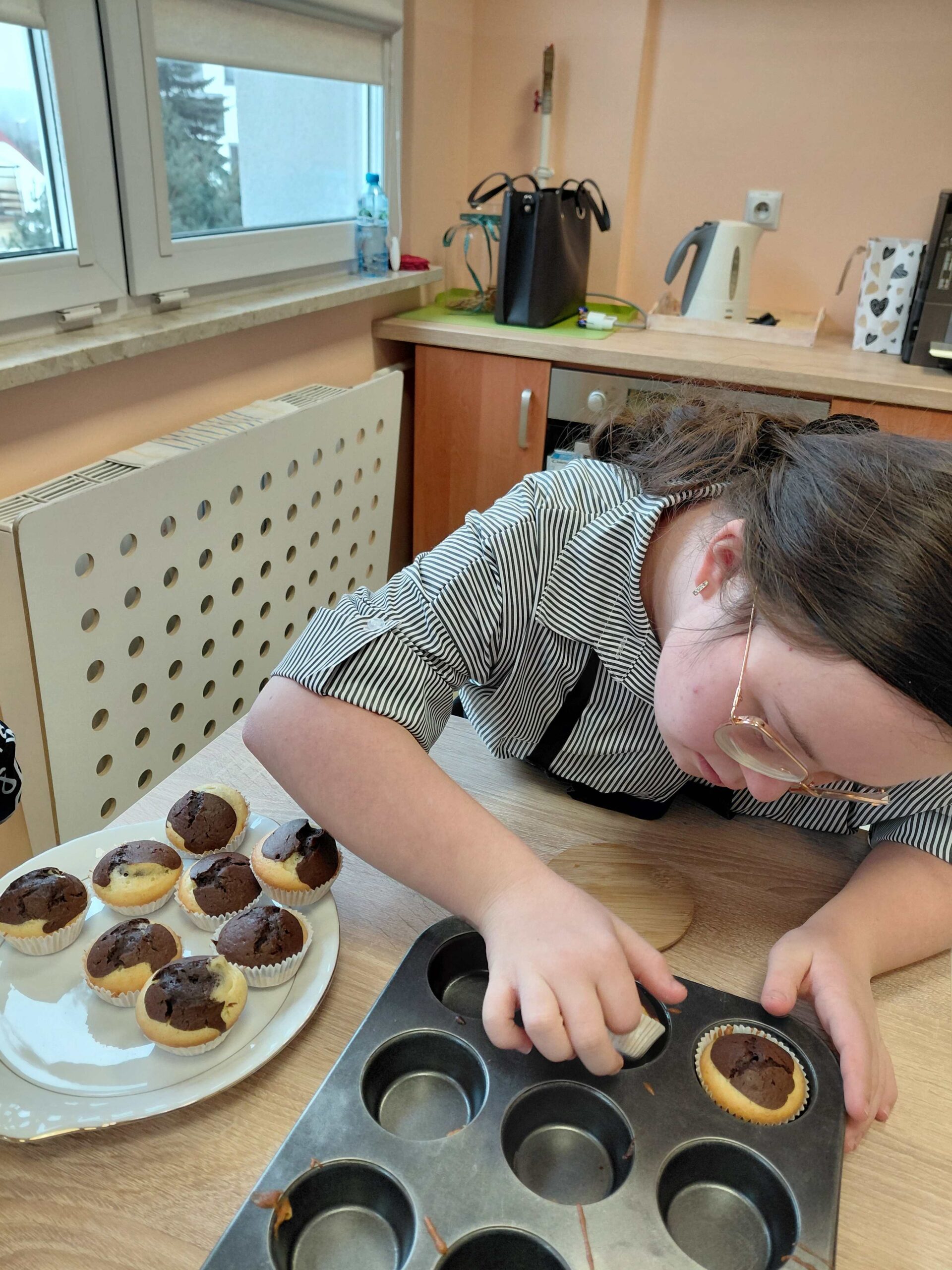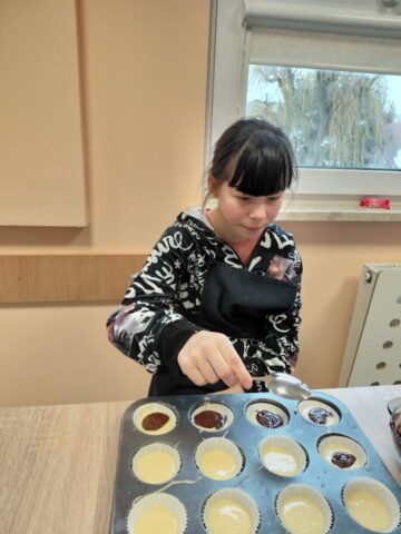 Warsztaty pieczenia „łaciatych” babeczek. Kolejni uczniowie ze Szkoły Podstawowej uczestniczyli w warsztatach cukierniczych, tym razem „łaciate” babeczki piekli: Martyna – kl. 8, Natalia kl. 5, Mateusz kl. 8 i Wiktor kl.8. Kilka prostych składników, zaangażowanie, dobra motywacja i chęć doskonalenia wystarczyły, aby powstały puszyste i wyśmienite muffinki. Przygotowując ciasto, uczniowie pod nadzorem nauczyciela korzystali z miksera planetarnego i piekarnika. Wdrażali się do pracy zespołowej, ćwiczyli umiejętność odmierzania składników i starannego mieszania ich oraz naprzemiennego napełniania papilotek ciastem waniliowym i czekoladowym. Niektóre z tych czynności wymagały precyzji, cierpliwości i wielu powtórzeń, ale końcowy efekt wynagrodził trud i wysiłek włożone w ich wykonanie. „Łaciate” babeczki smakowały i prezentowały się znakomicie.