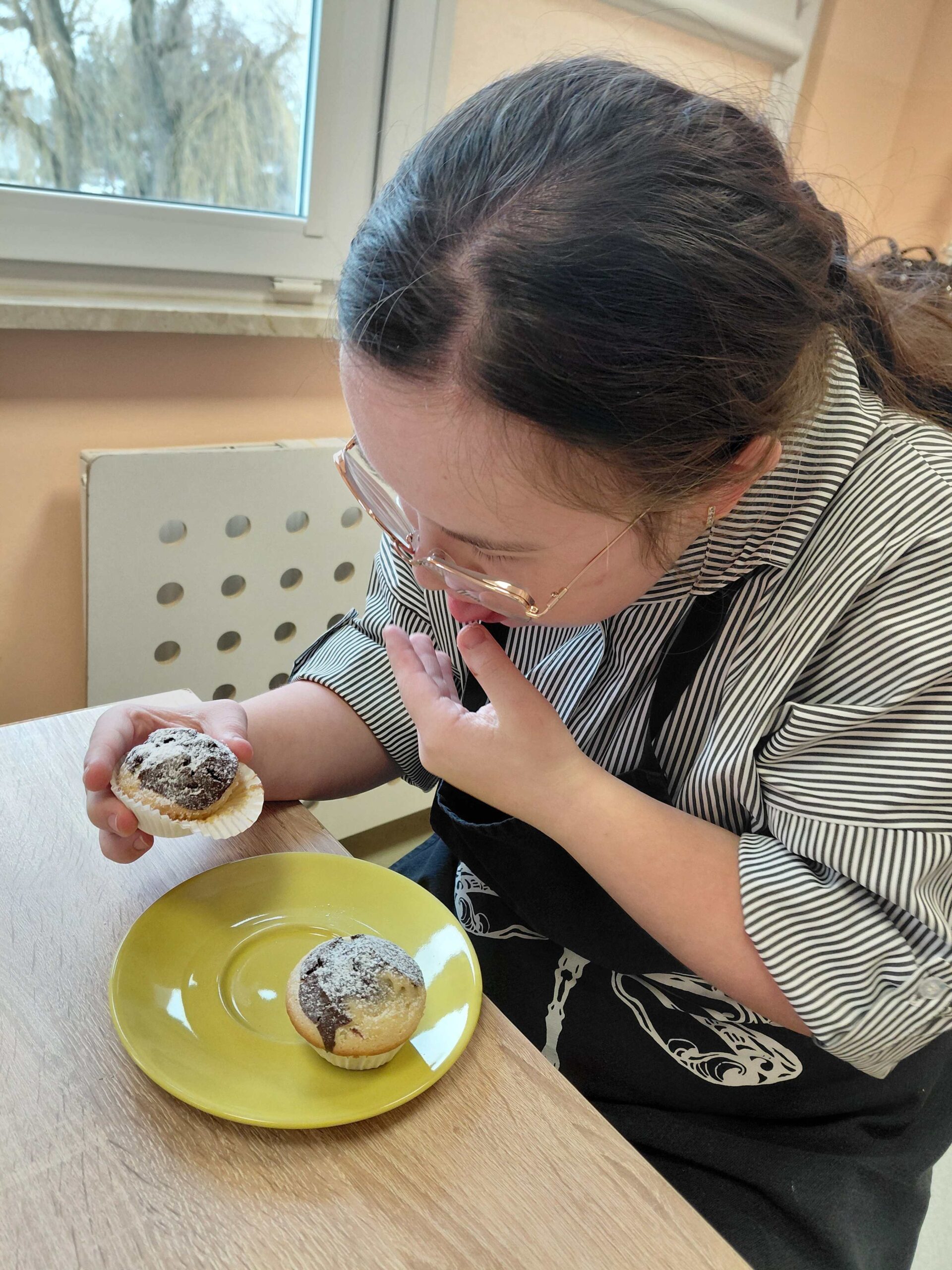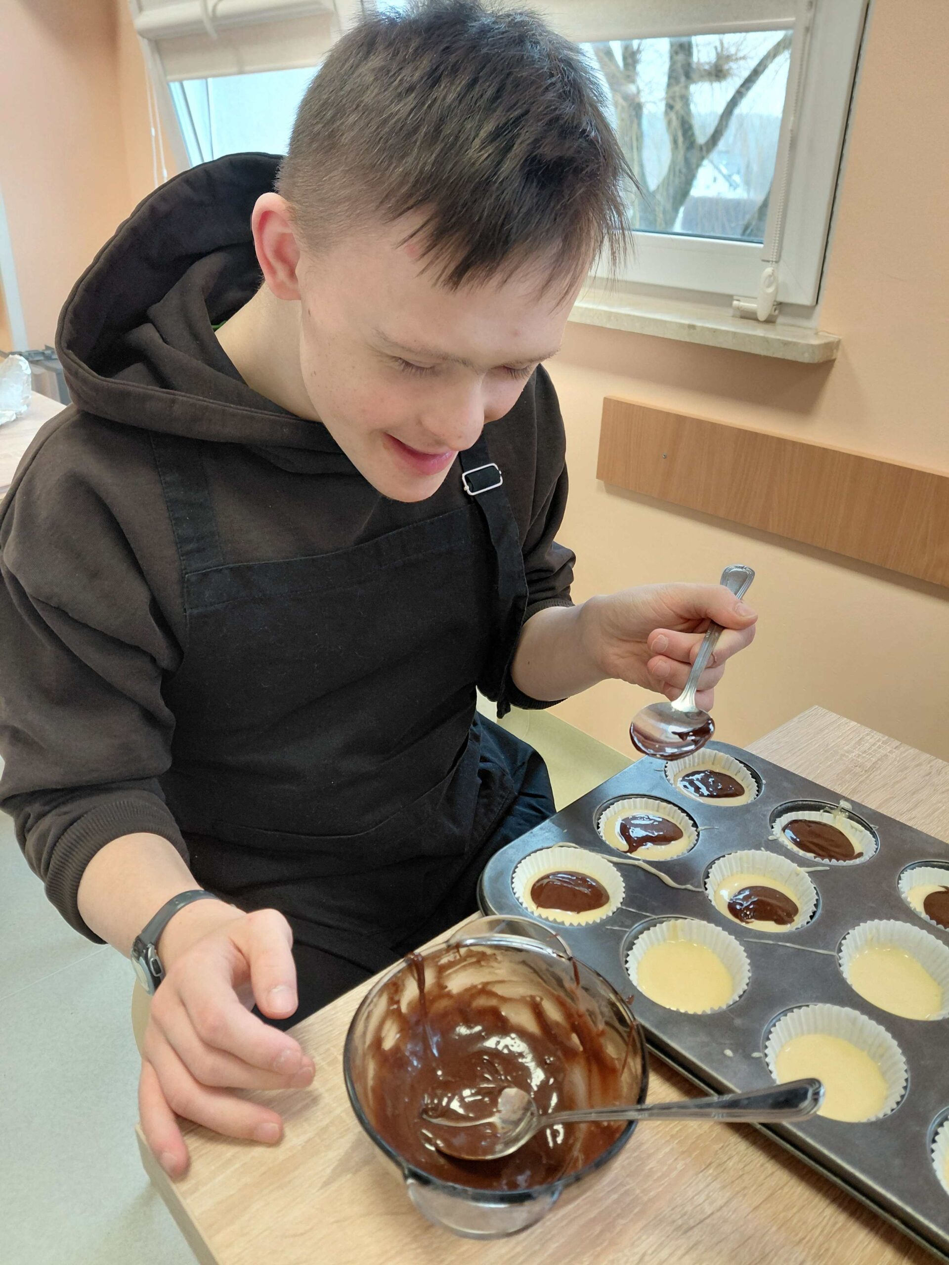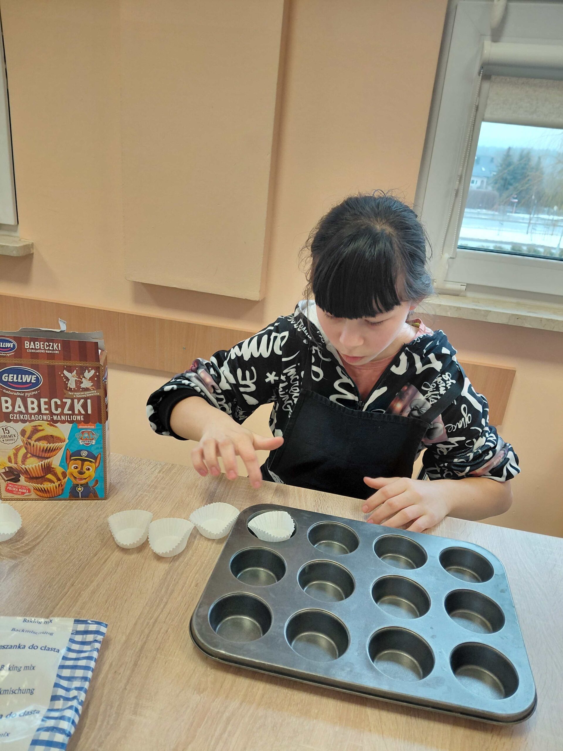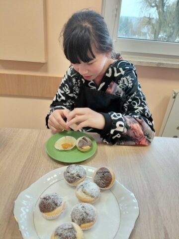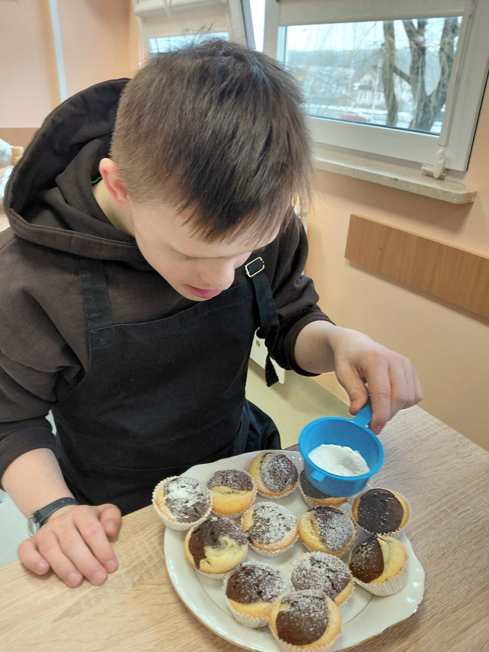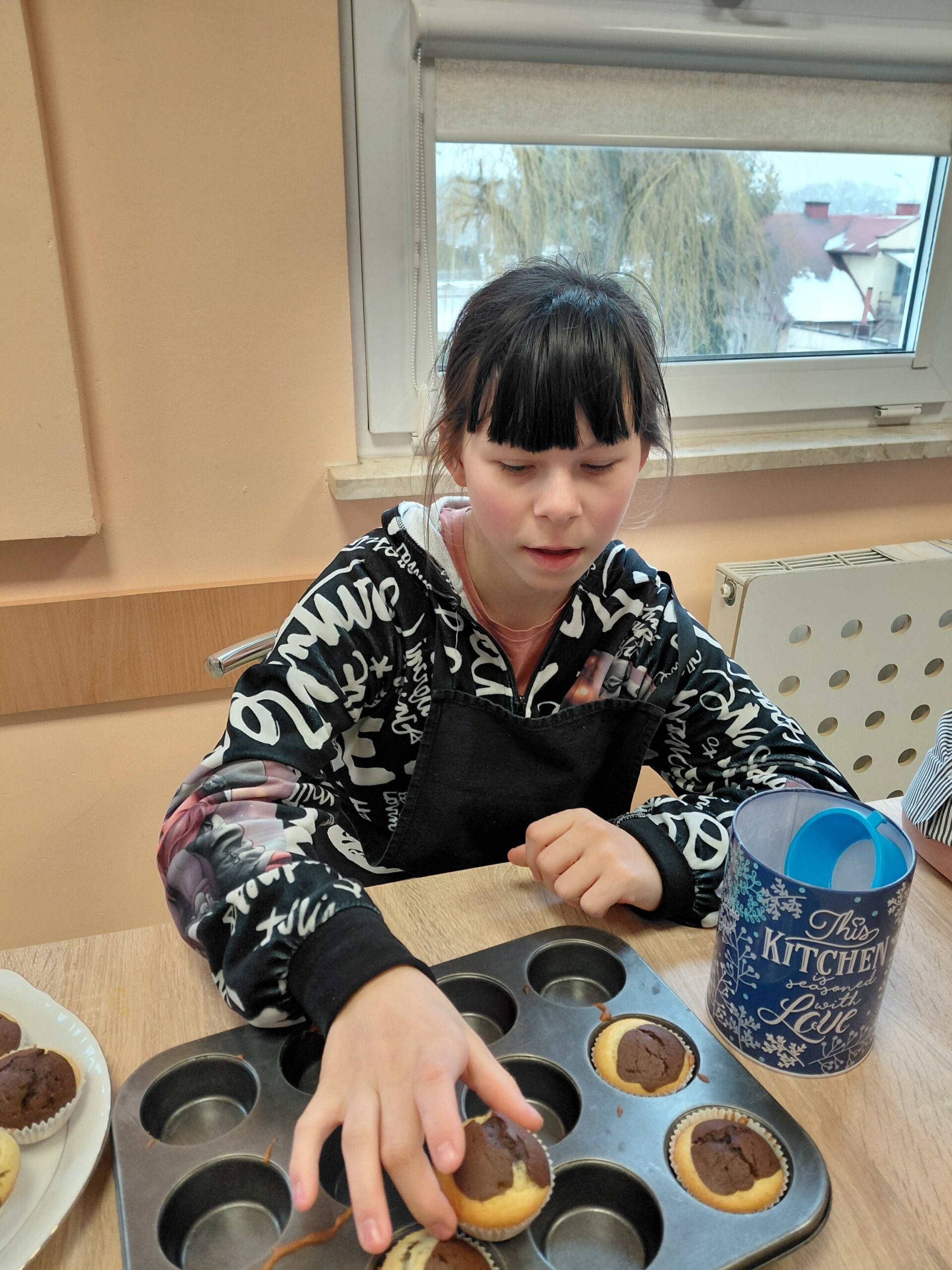 Warsztaty pieczenia „łaciatych” babeczek. Kolejni uczniowie ze Szkoły Podstawowej uczestniczyli w warsztatach cukierniczych, tym razem „łaciate” babeczki piekli: Martyna – kl. 8, Natalia kl. 5, Mateusz kl. 8 i Wiktor kl.8. Kilka prostych składników, zaangażowanie, dobra motywacja i chęć doskonalenia wystarczyły, aby powstały puszyste i wyśmienite muffinki. Przygotowując ciasto, uczniowie pod nadzorem nauczyciela korzystali z miksera planetarnego i piekarnika. Wdrażali się do pracy zespołowej, ćwiczyli umiejętność odmierzania składników i starannego mieszania ich oraz naprzemiennego napełniania papilotek ciastem waniliowym i czekoladowym. Niektóre z tych czynności wymagały precyzji, cierpliwości i wielu powtórzeń, ale końcowy efekt wynagrodził trud i wysiłek włożone w ich wykonanie. „Łaciate” babeczki smakowały i prezentowały się znakomicie.