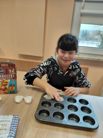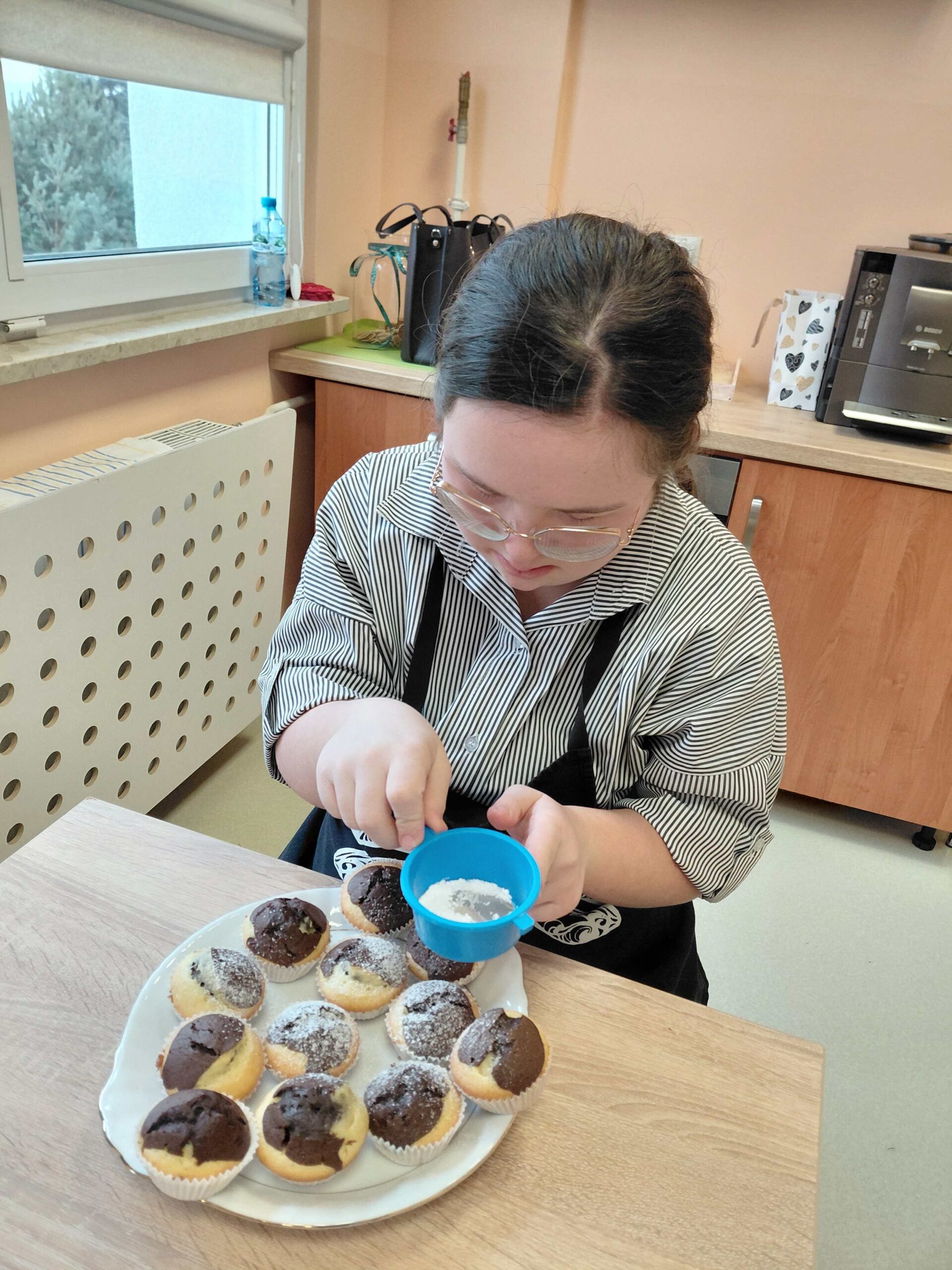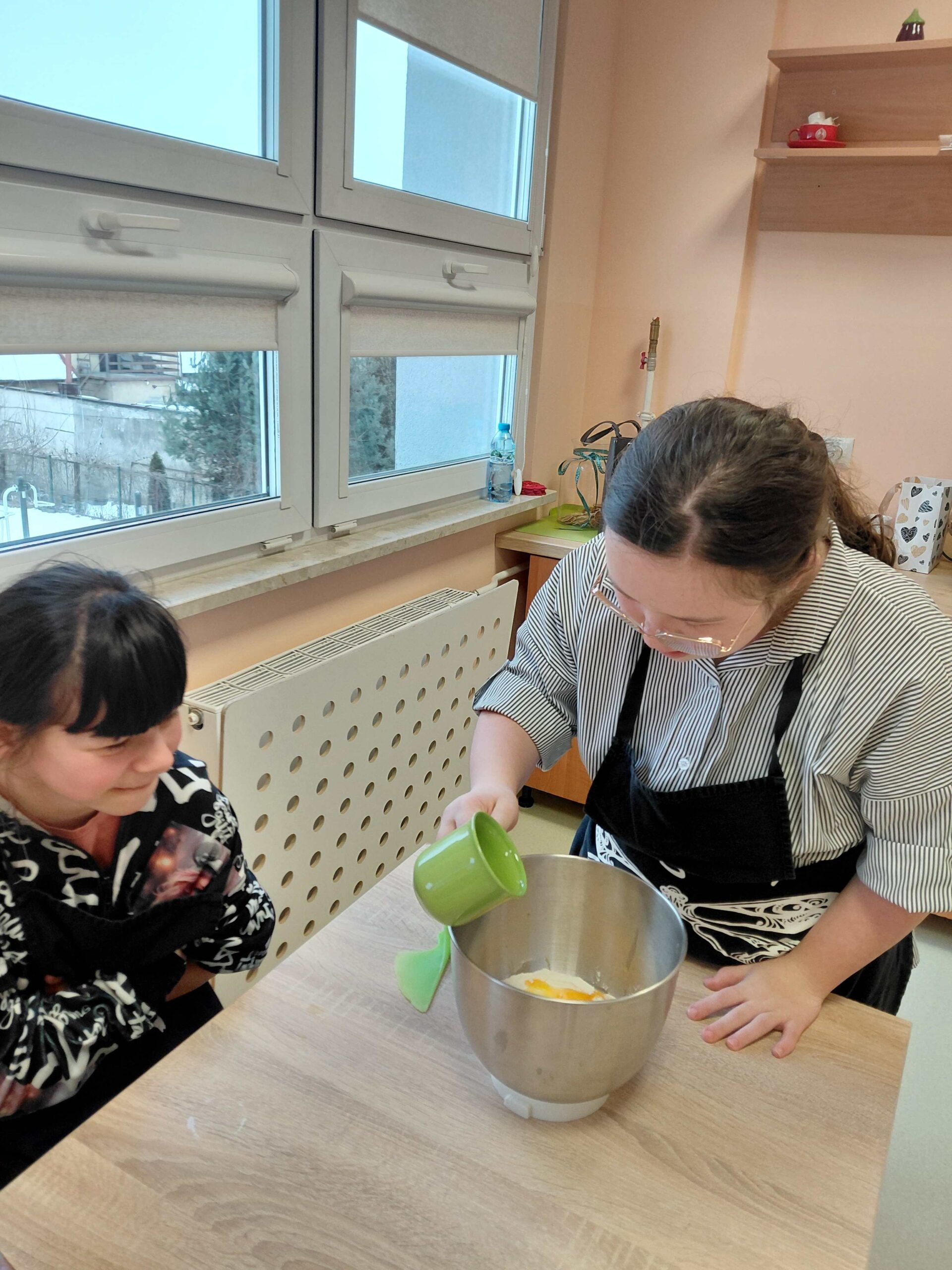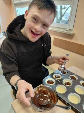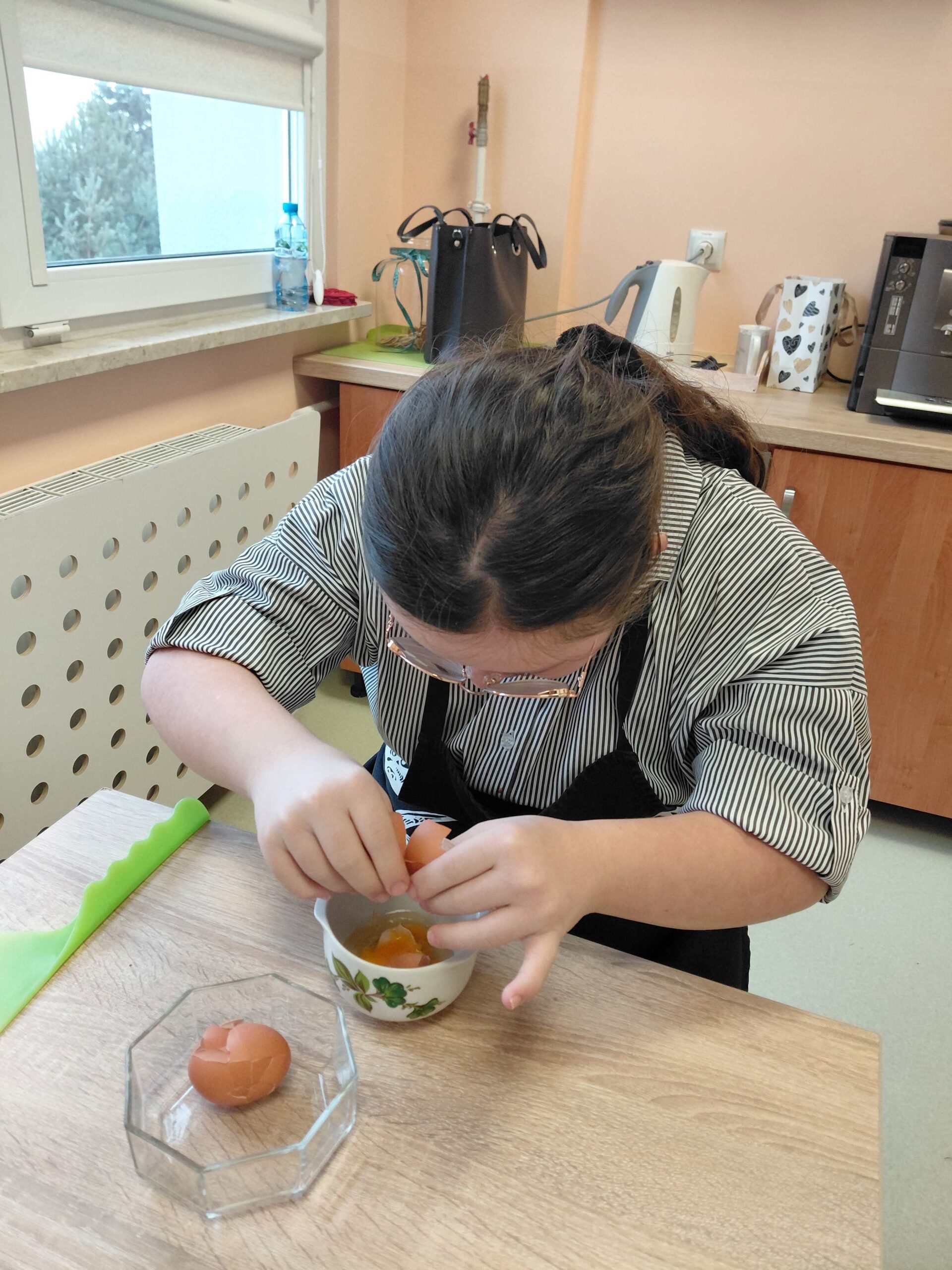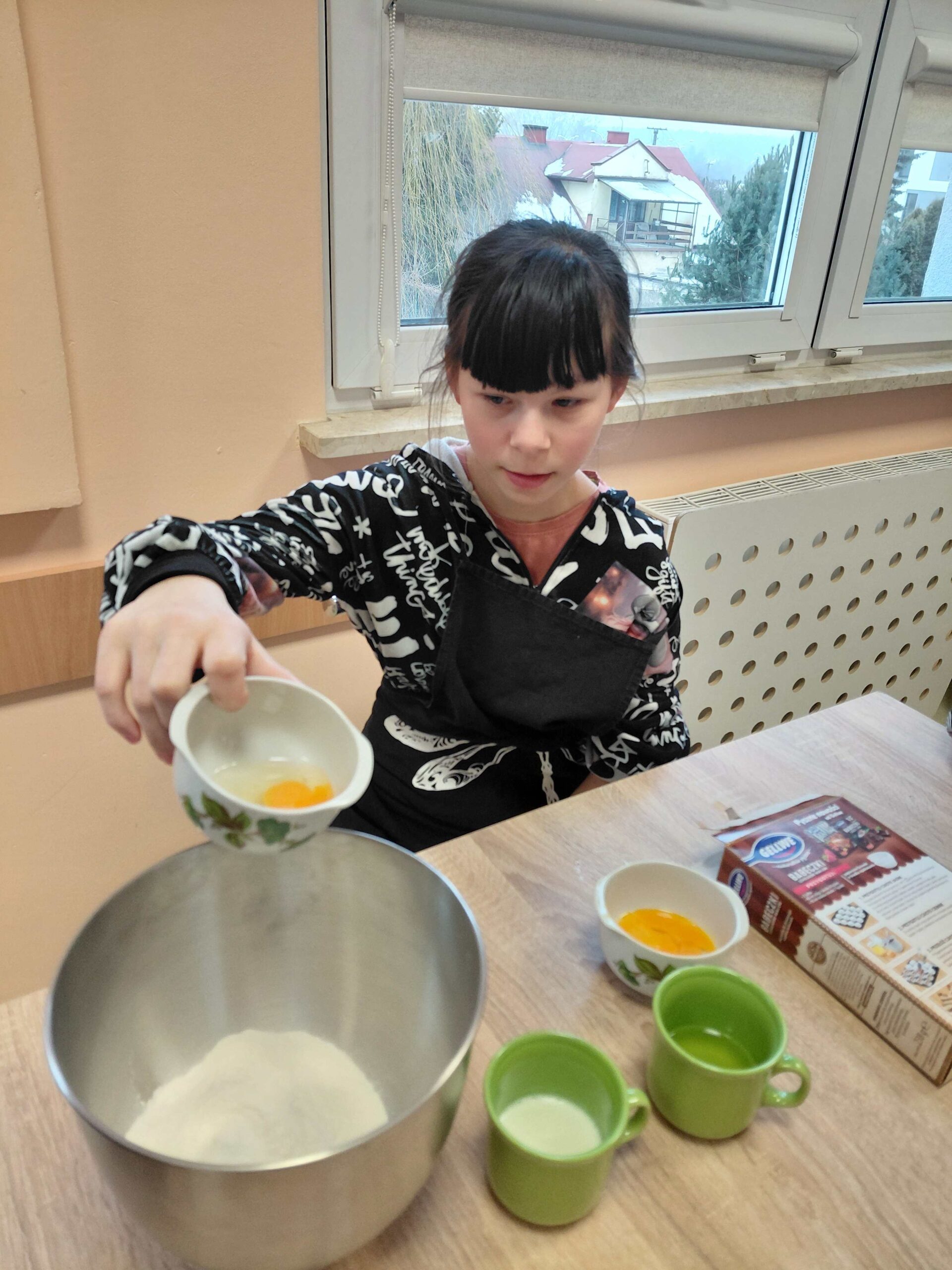 Warsztaty pieczenia „łaciatych” babeczek. Kolejni uczniowie ze Szkoły Podstawowej uczestniczyli w warsztatach cukierniczych, tym razem „łaciate” babeczki piekli: Martyna – kl. 8, Natalia kl. 5, Mateusz kl. 8 i Wiktor kl.8. Kilka prostych składników, zaangażowanie, dobra motywacja i chęć doskonalenia wystarczyły, aby powstały puszyste i wyśmienite muffinki. Przygotowując ciasto, uczniowie pod nadzorem nauczyciela korzystali z miksera planetarnego i piekarnika. Wdrażali się do pracy zespołowej, ćwiczyli umiejętność odmierzania składników i starannego mieszania ich oraz naprzemiennego napełniania papilotek ciastem waniliowym i czekoladowym. Niektóre z tych czynności wymagały precyzji, cierpliwości i wielu powtórzeń, ale końcowy efekt wynagrodził trud i wysiłek włożone w ich wykonanie. „Łaciate” babeczki smakowały i prezentowały się znakomicie.