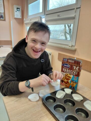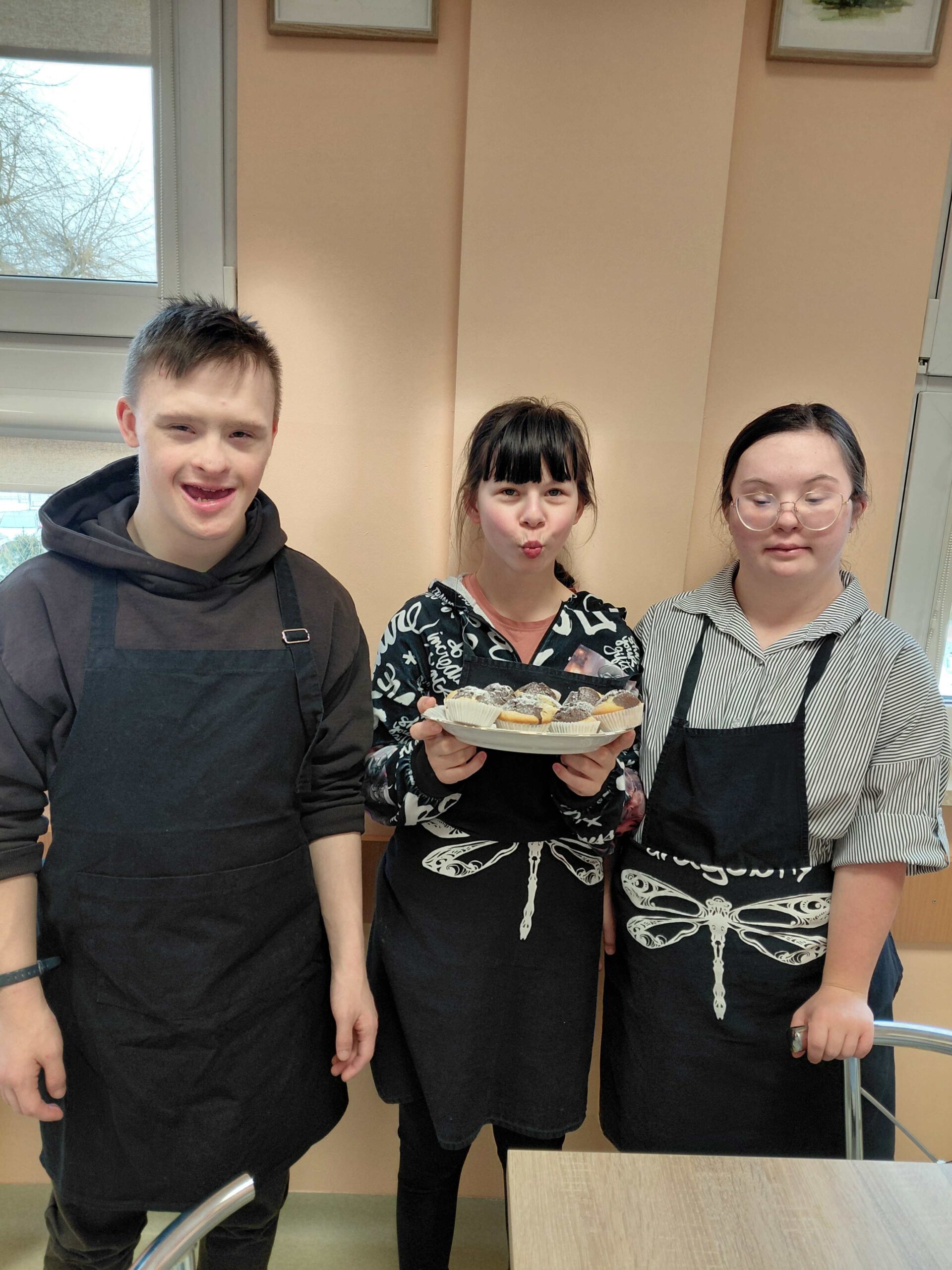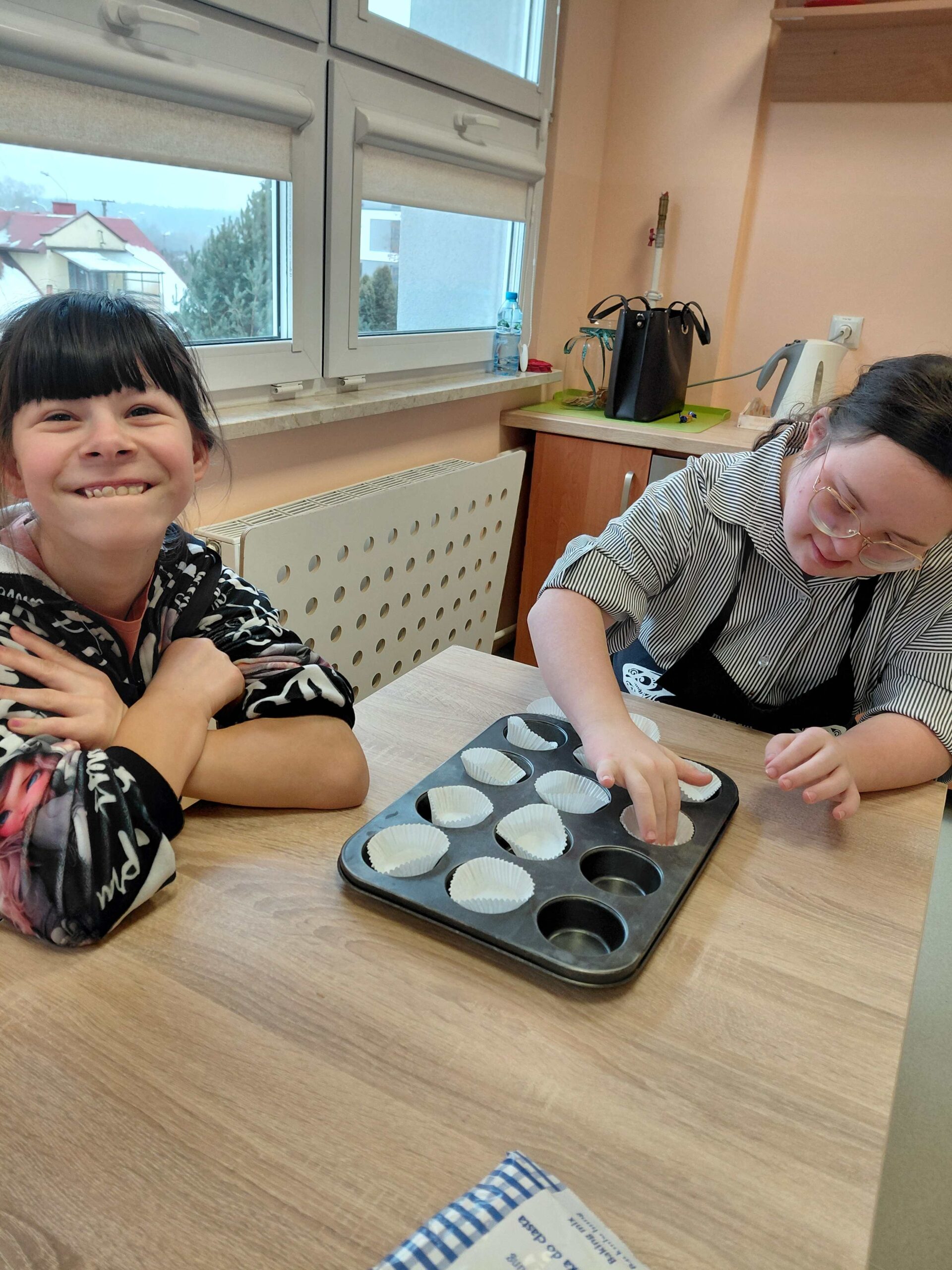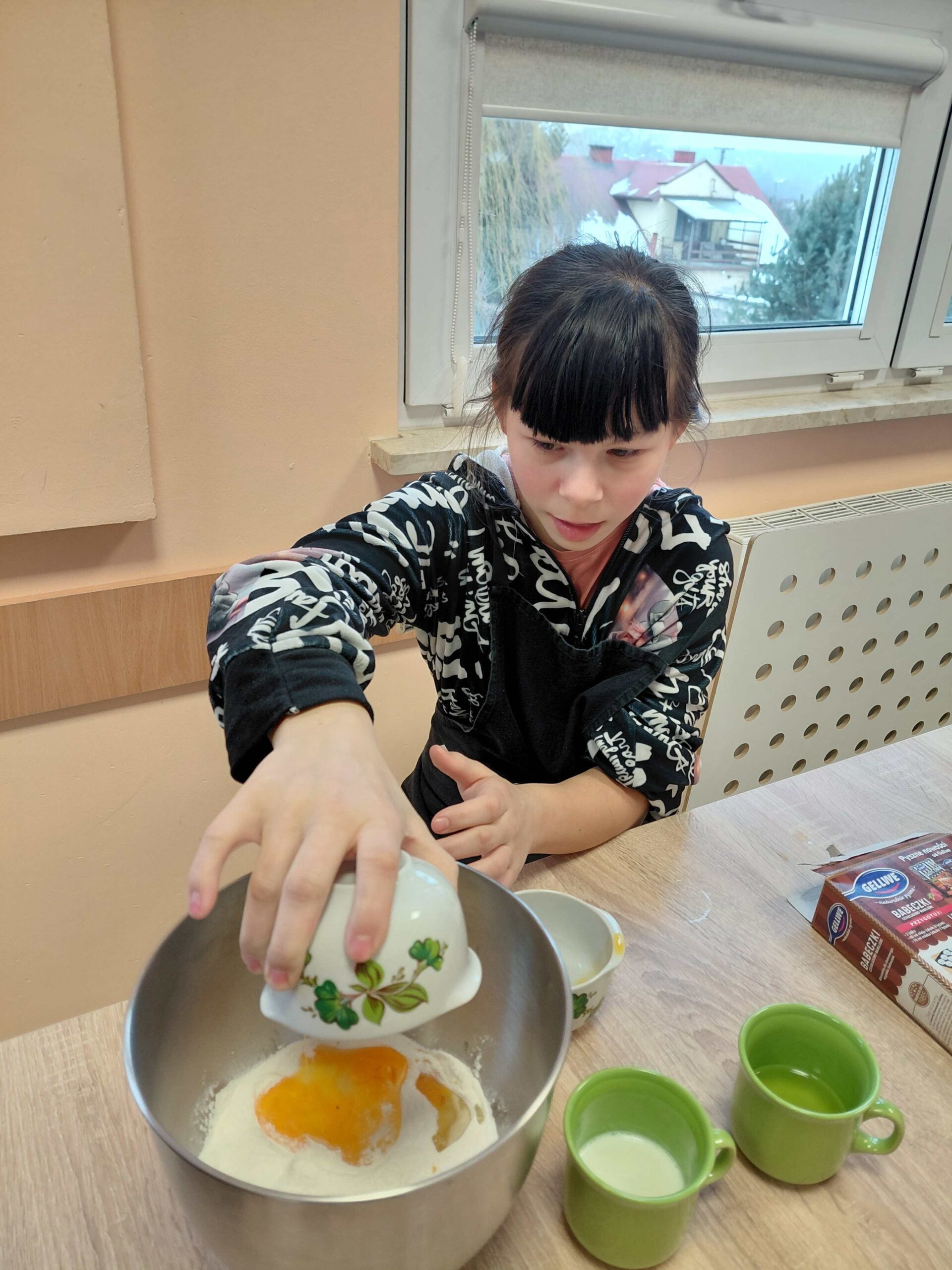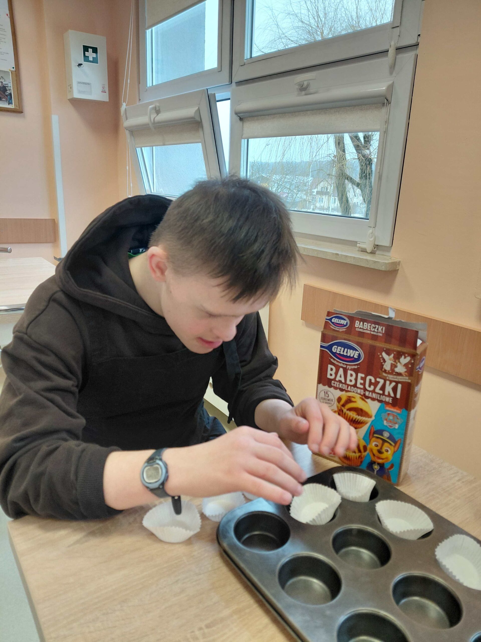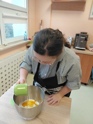 Warsztaty pieczenia „łaciatych” babeczek. Kolejni uczniowie ze Szkoły Podstawowej uczestniczyli w warsztatach cukierniczych, tym razem „łaciate” babeczki piekli: Martyna – kl. 8, Natalia kl. 5, Mateusz kl. 8 i Wiktor kl.8. Kilka prostych składników, zaangażowanie, dobra motywacja i chęć doskonalenia wystarczyły, aby powstały puszyste i wyśmienite muffinki. Przygotowując ciasto, uczniowie pod nadzorem nauczyciela korzystali z miksera planetarnego i piekarnika. Wdrażali się do pracy zespołowej, ćwiczyli umiejętność odmierzania składników i starannego mieszania ich oraz naprzemiennego napełniania papilotek ciastem waniliowym i czekoladowym. Niektóre z tych czynności wymagały precyzji, cierpliwości i wielu powtórzeń, ale końcowy efekt wynagrodził trud i wysiłek włożone w ich wykonanie. „Łaciate” babeczki smakowały i prezentowały się znakomicie.