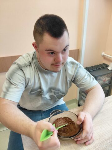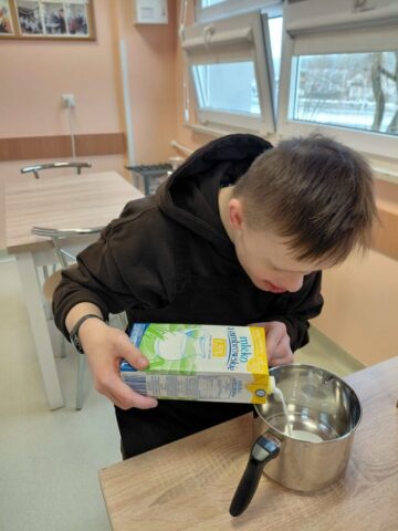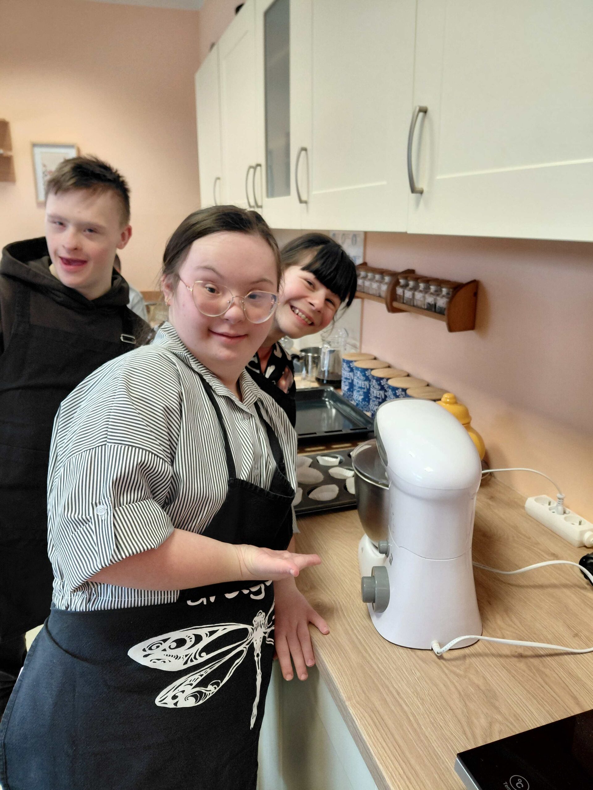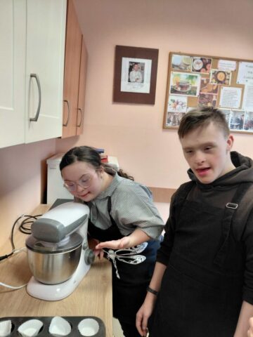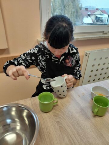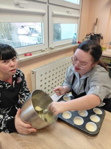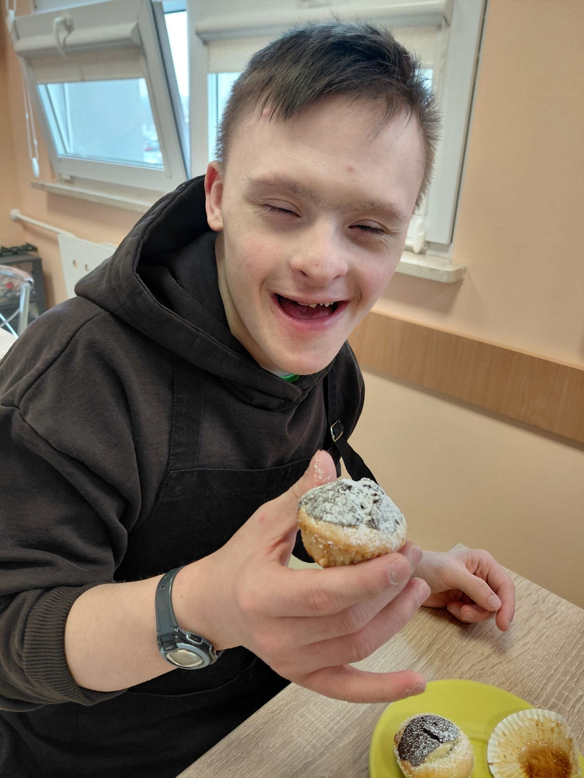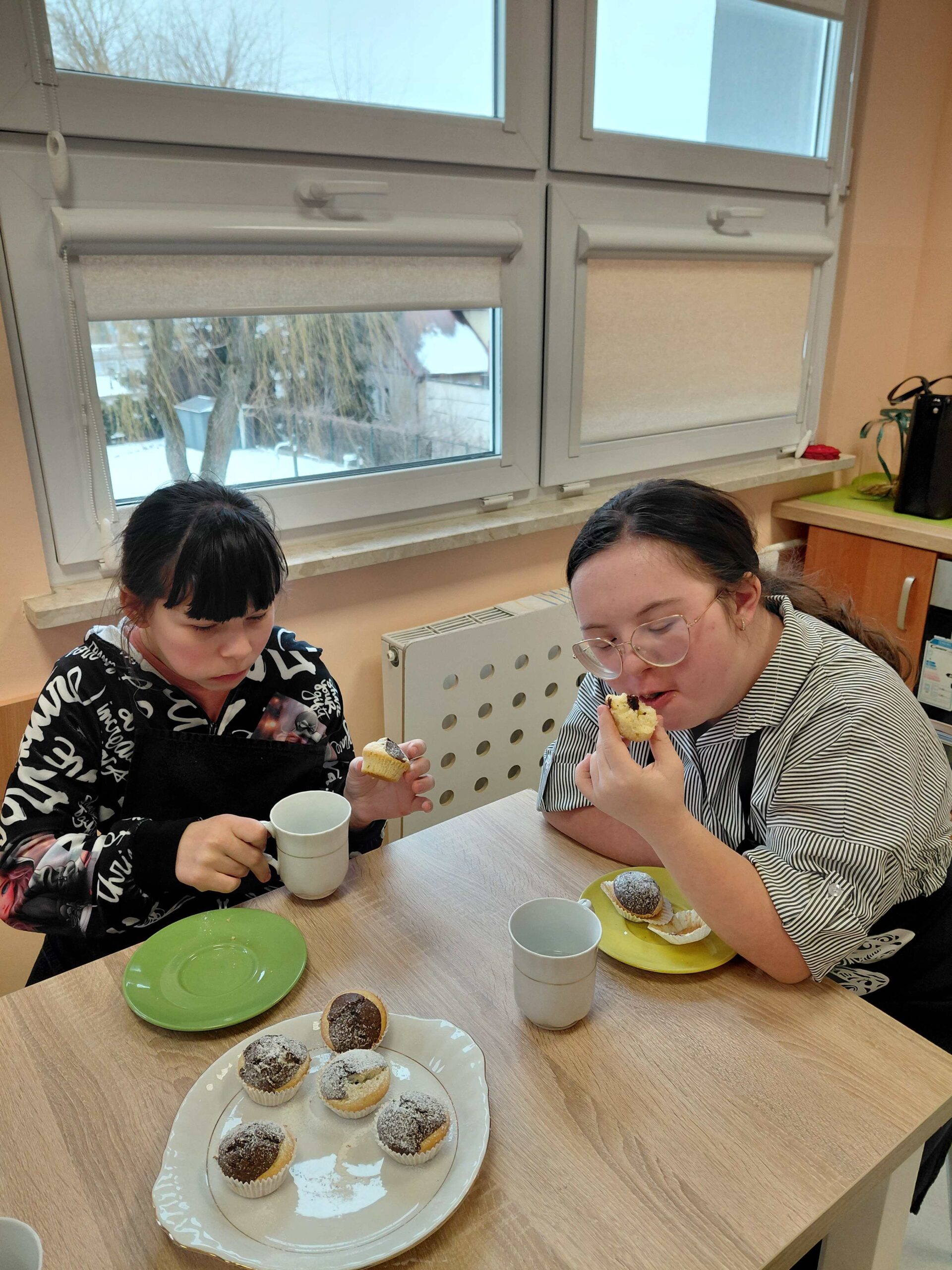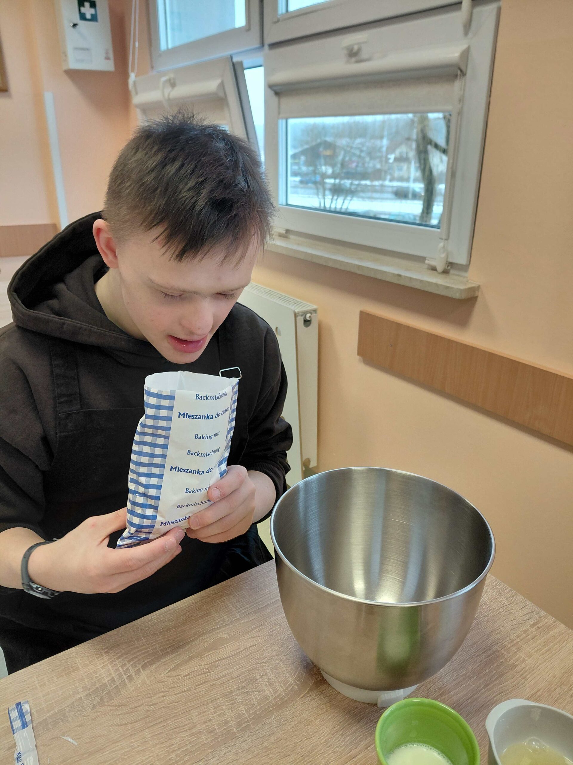 Warsztaty pieczenia „łaciatych” babeczek. Kolejni uczniowie ze Szkoły Podstawowej uczestniczyli w warsztatach cukierniczych, tym razem „łaciate” babeczki piekli: Martyna – kl. 8, Natalia kl. 5, Mateusz kl. 8 i Wiktor kl.8. Kilka prostych składników, zaangażowanie, dobra motywacja i chęć doskonalenia wystarczyły, aby powstały puszyste i wyśmienite muffinki. Przygotowując ciasto, uczniowie pod nadzorem nauczyciela korzystali z miksera planetarnego i piekarnika. Wdrażali się do pracy zespołowej, ćwiczyli umiejętność odmierzania składników i starannego mieszania ich oraz naprzemiennego napełniania papilotek ciastem waniliowym i czekoladowym. Niektóre z tych czynności wymagały precyzji, cierpliwości i wielu powtórzeń, ale końcowy efekt wynagrodził trud i wysiłek włożone w ich wykonanie. „Łaciate” babeczki smakowały i prezentowały się znakomicie.