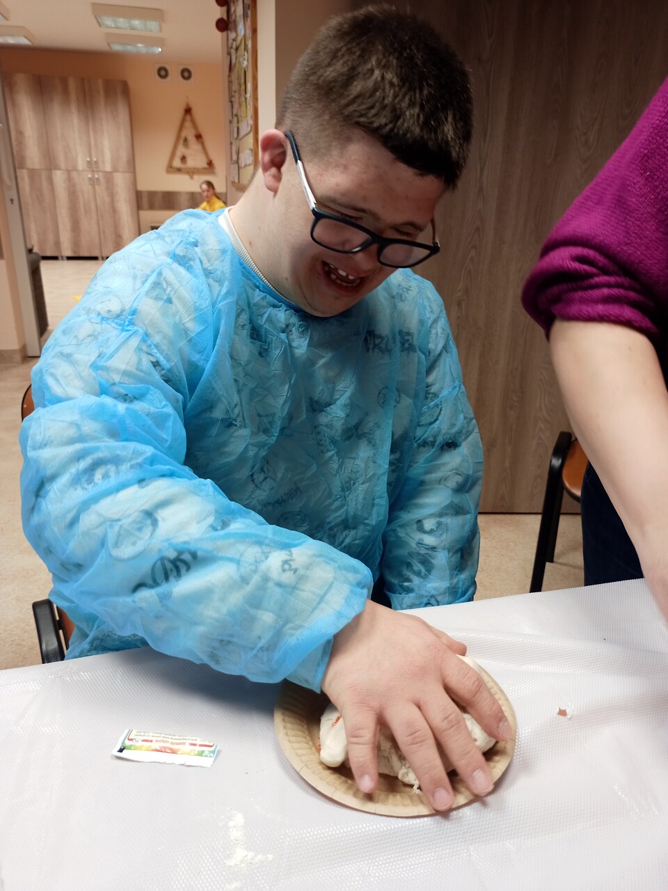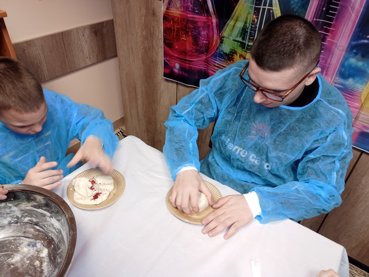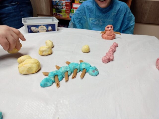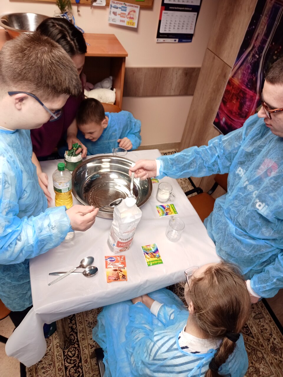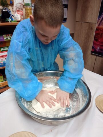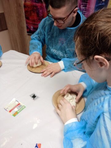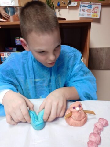 Zabawy z ciastoliną własnej produkcji. Po feriach powrócićliśmy do naszych eksperymentów sensorycznych, tym razem wychowankowie grup wychowawczych wyonali domową ciastolinę. Proces powstawania tej masy plastycznej budził wśród wychowanków duże zainteresowanie. Każdy chętny otrzymał swoje zadanie do wykonania i cierpliwie czekał na swoją kolej. Odmierzaliśmy właściwe proporcje, mieszaliśmy składniki i ugniataliśmy wszystko na jedną, gładką masę. Potem było już tylko twórczo. Podczas zabawy wychowankowie rozwijali swoją kreatywność, motorykę i zdolności manualne.