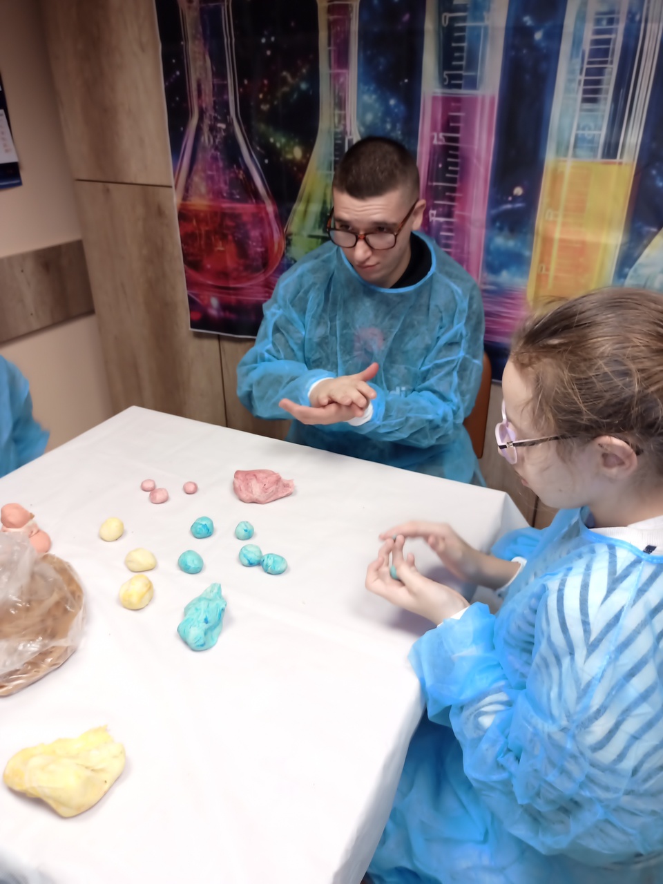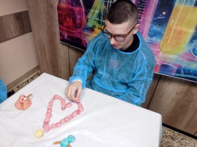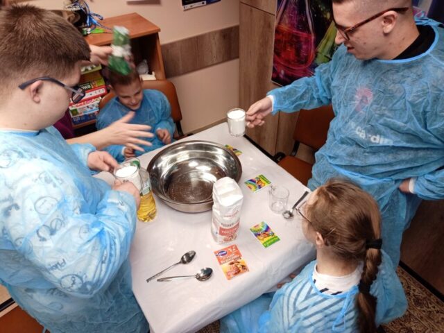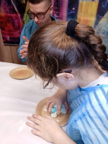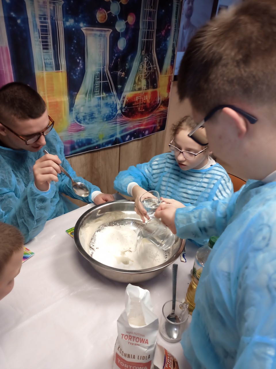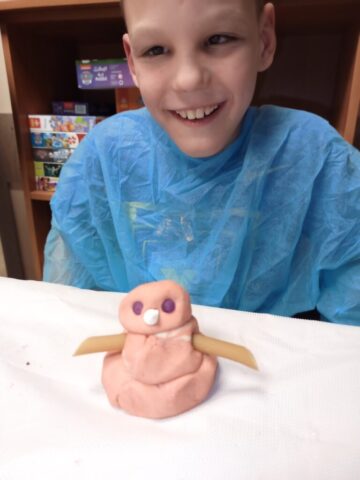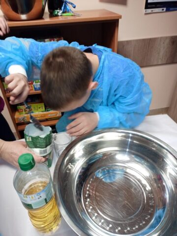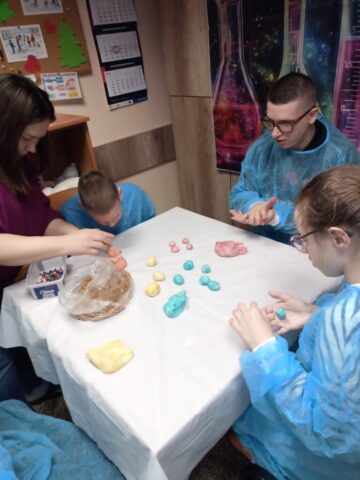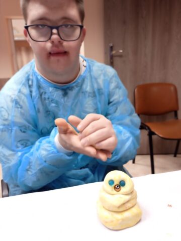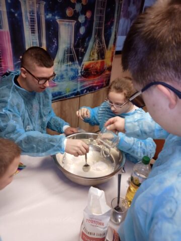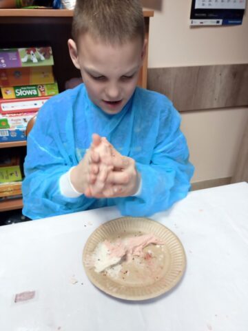 Zabawy z ciastoliną własnej produkcji. Po feriach powrócićliśmy do naszych eksperymentów sensorycznych, tym razem wychowankowie grup wychowawczych wyonali domową ciastolinę. Proces powstawania tej masy plastycznej budził wśród wychowanków duże zainteresowanie. Każdy chętny otrzymał swoje zadanie do wykonania i cierpliwie czekał na swoją kolej. Odmierzaliśmy właściwe proporcje, mieszaliśmy składniki i ugniataliśmy wszystko na jedną, gładką masę. Potem było już tylko twórczo. Podczas zabawy wychowankowie rozwijali swoją kreatywność, motorykę i zdolności manualne.