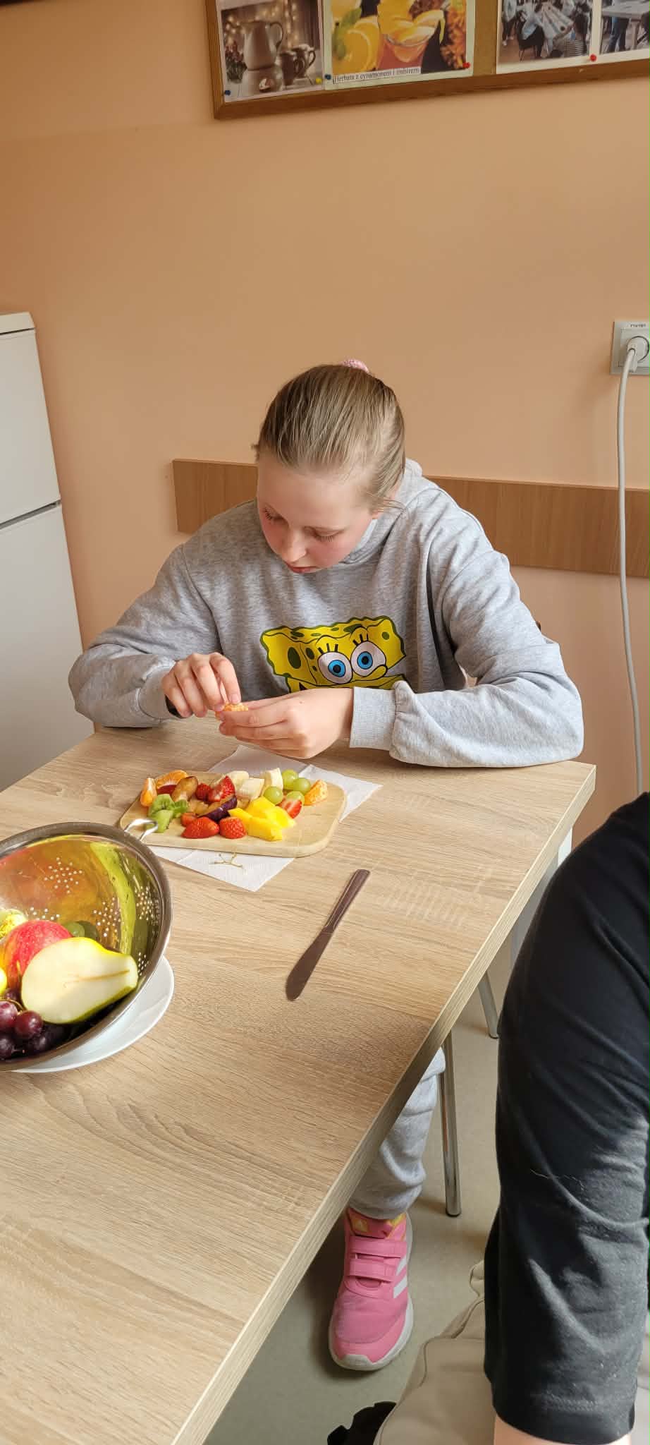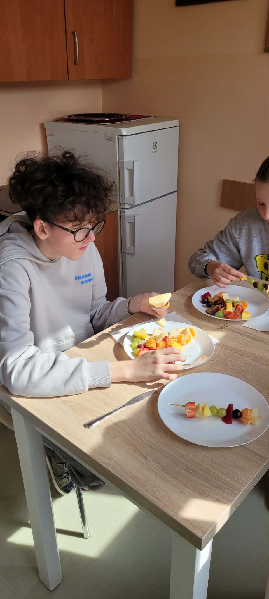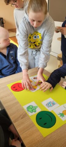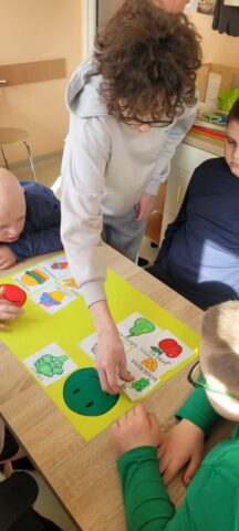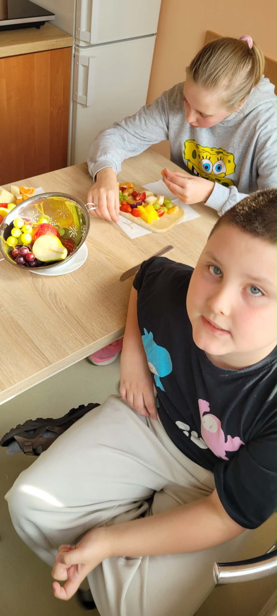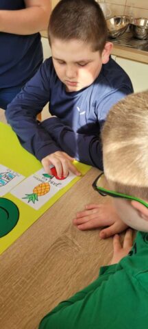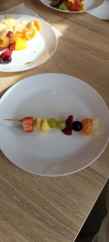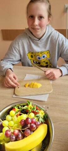 Uczniowie klas 1,2,3,7, i 8 poznali zasady higienicznego przygotowania owoców: dokładne mycie, obieranie i krojenie. Następnie każdy mógł samodzielnie skomponować własny, kolorowy szaszłyk, łącząc ulubione smaki i tworząc ciekawe wzory. Podczas zajęć rozmawialiśmy także o wartości odżywczej owoców, a także segregowaliśmy produkty na zdrowe i niezdrowe.